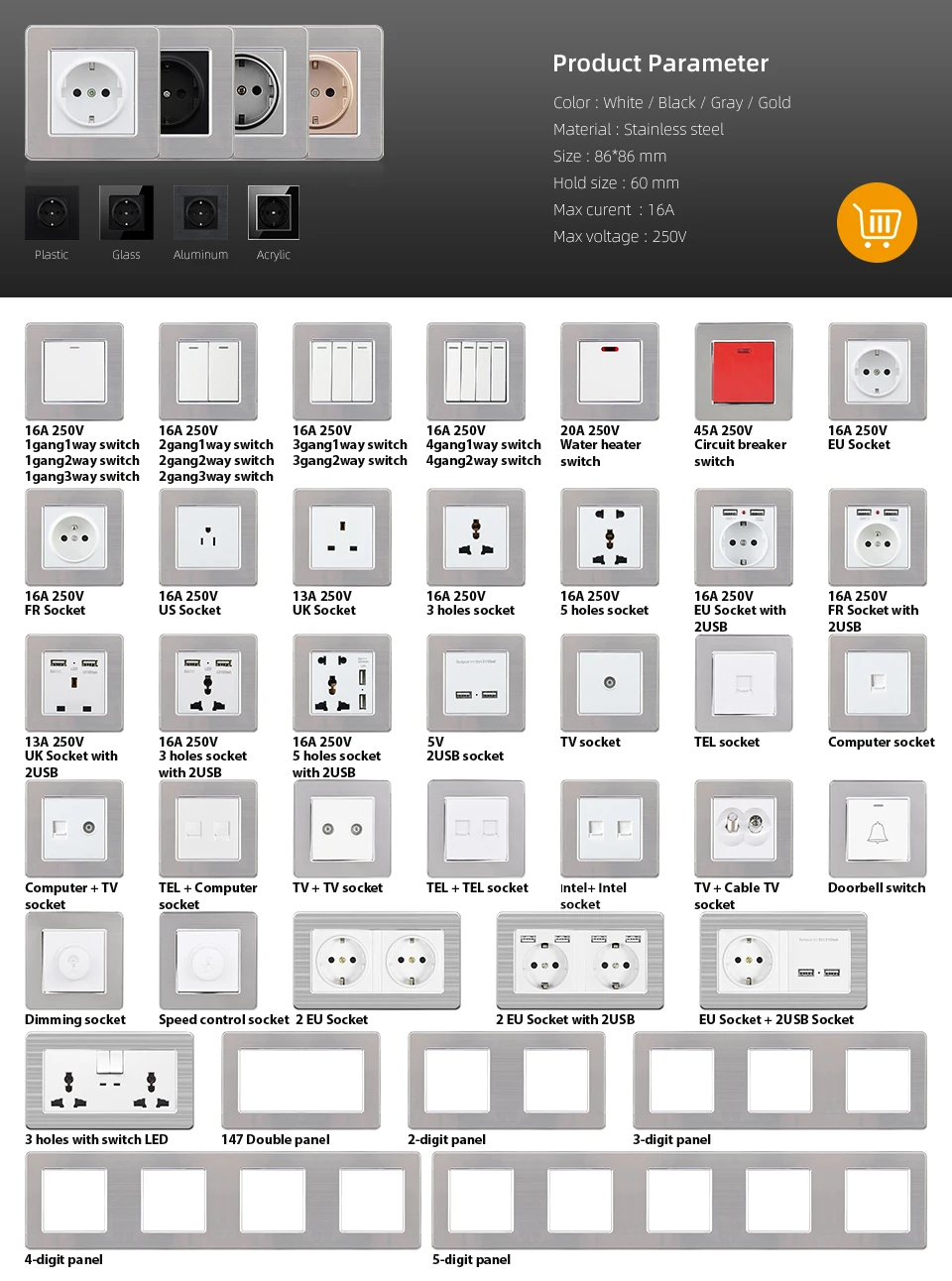 Тип: настенный выключатель/розеткаЦвет: черный/шампанское золото/БелыйМатериал панели: нержавеющая стальРазмер переключателя (Д * Ш): 86 мм * 86 ммУпаковочный лист:1x розетка2x винт