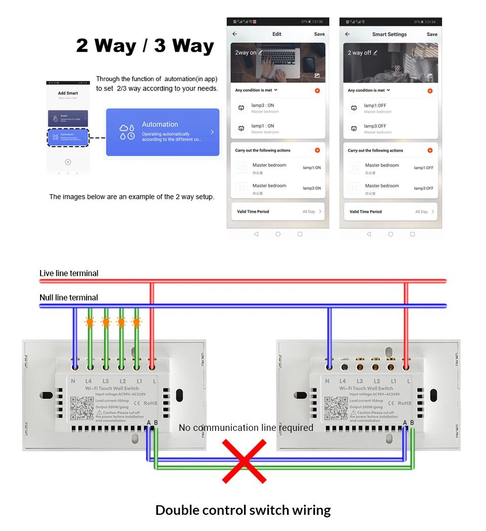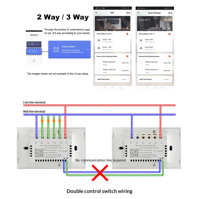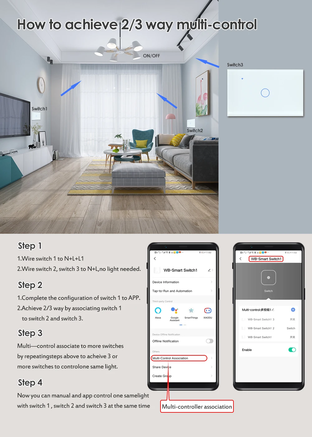 Шаг 11. Проводной переключатель 1-N + L + L12. Проводной переключатель 2, переключатель 3 в N + L, светильник не требуется.Шаг 21. Завершите настройку переключателя 1 в приложение.2. Достигните 2/3 способов, подключив переключатель 1 к переключателю 2 и переключатель 3.Шаг 3Мульти-контроль связывается с большим количеством переключателей с помощью повторений выше для включения 3 или более переключателей для управления одним и тем же светом.Шаг 4Теперь вы можете управлять одним и тем же светом вручную с помощью переключателя 1, переключателя 2 и переключателя 3 одновременно