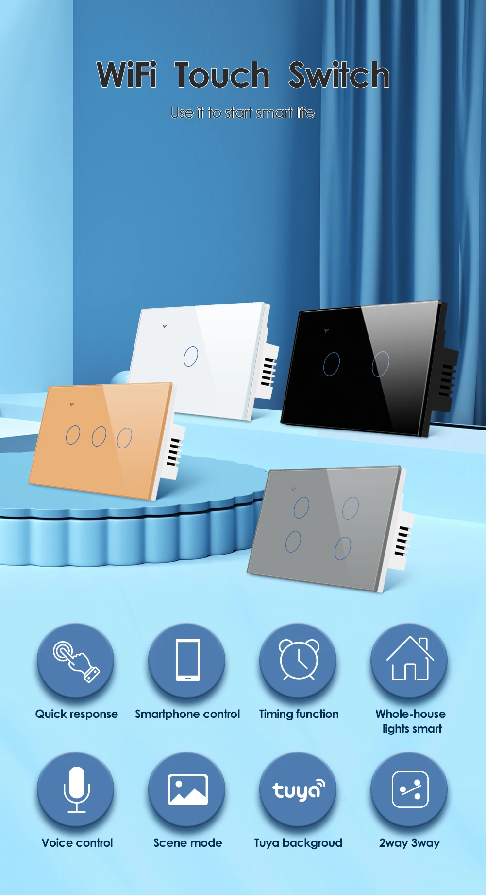A. Модель: сенсорный переключатель Wi-FiB. Напряжение: 100-240 ВC. Стандарт беспроводной связи: Wi-Fi 2,4 ГГцD. Рабочая среда: -30 ~ 70 градусов Цельсия; Менее 95% относительной влажностиE. Материал панели: закаленное Хрустальное стеклоF. Основной материал: пластикG. Механический срок службы: 100000 раз работы