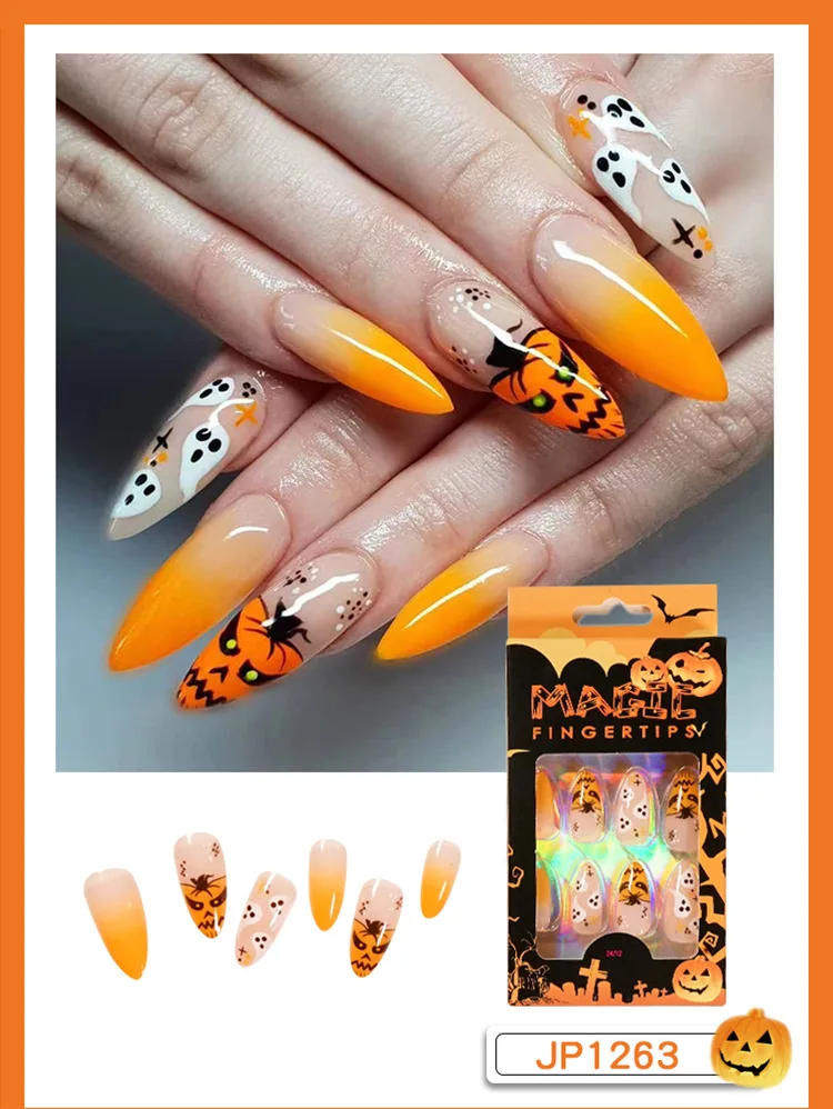 Накладные ногти на Хэллоуин, 24 шт., накладные ногти в стиле панк с тыквой, накладные ногти со съемным клеем, полное покрытие, накладные ногти