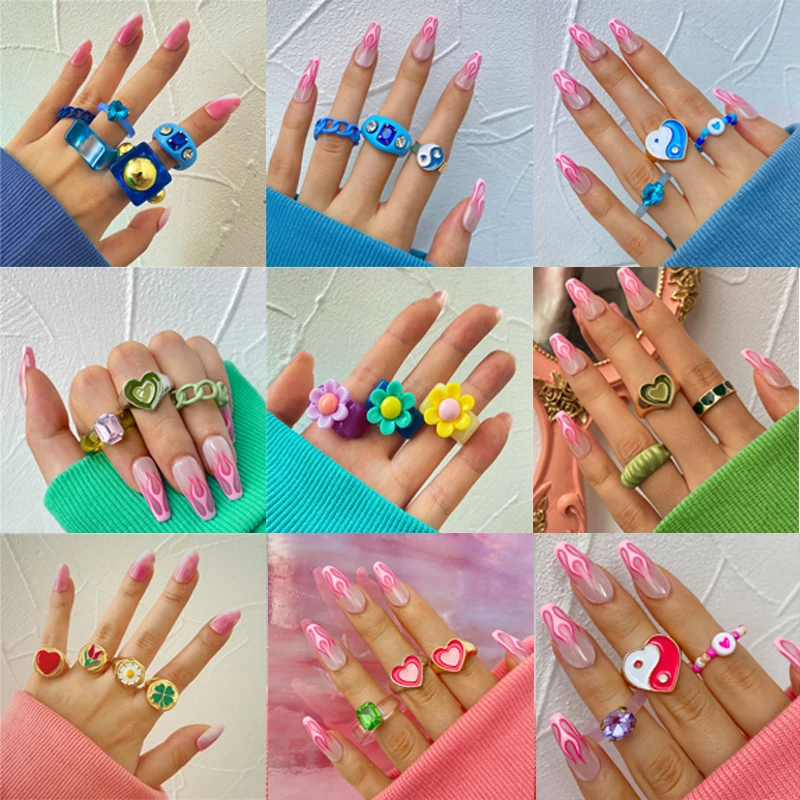 Набор разноцветных колец с бусинами Y2K, ювелирные изделия с тюльпа...