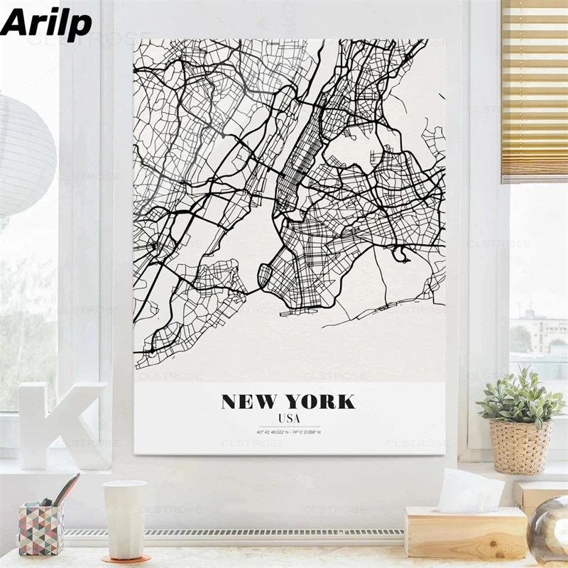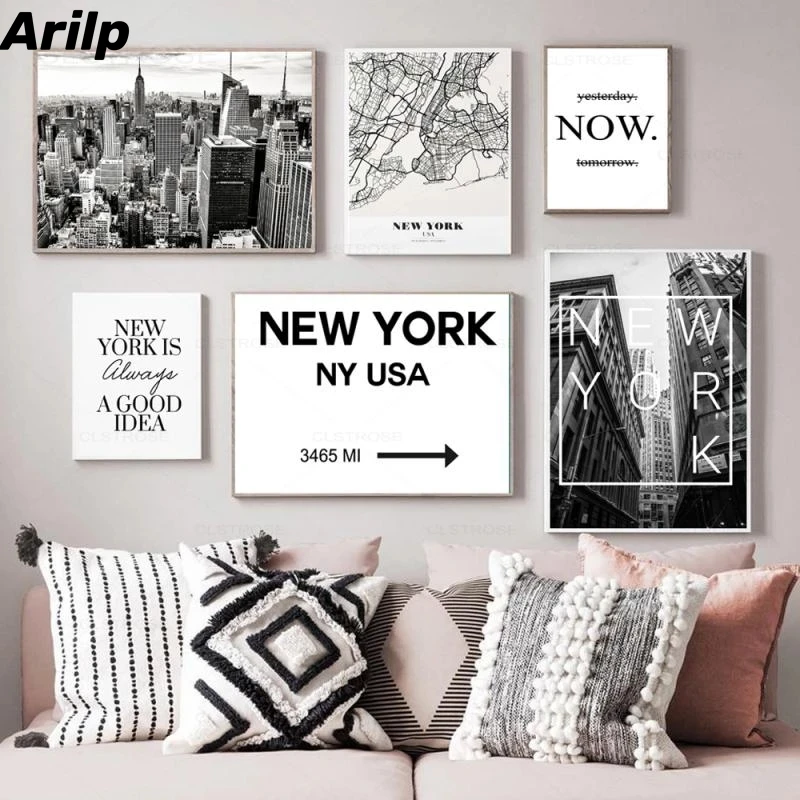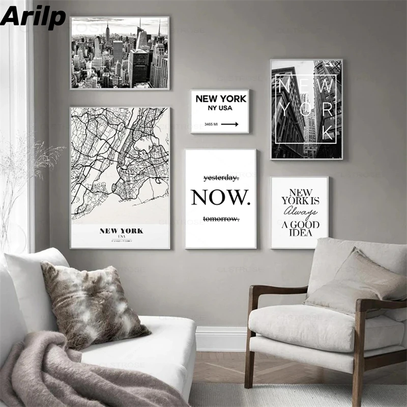 Картина на холсте с изображением карты Нью-Йорка, архитектурная фотография, черно-белая цитата, настенный художественный плакат, домашний декор