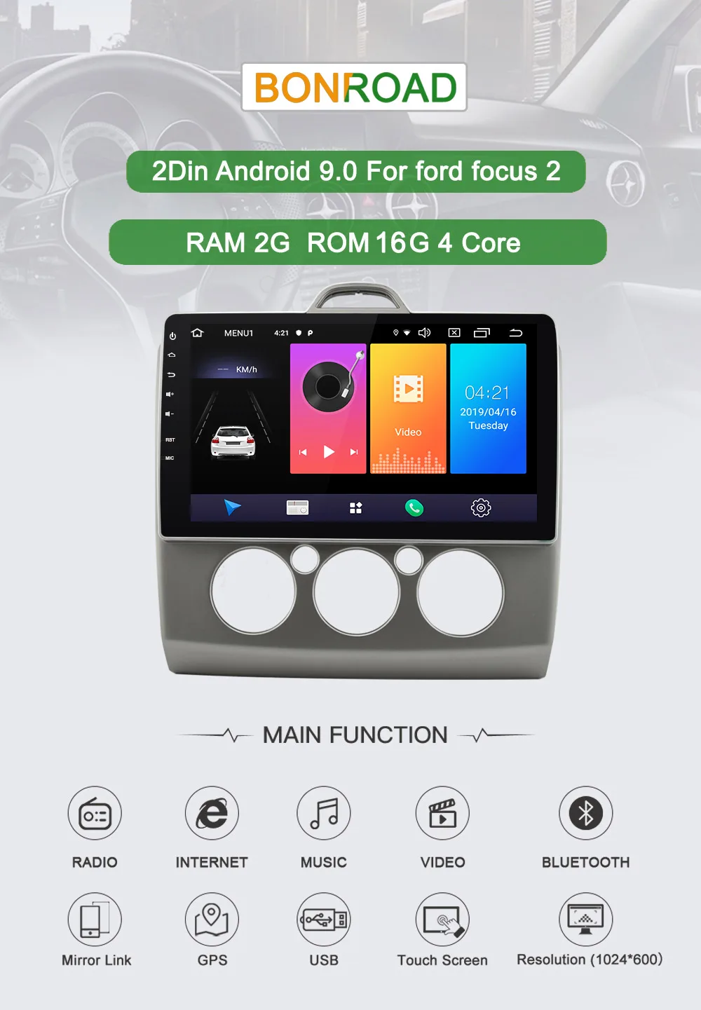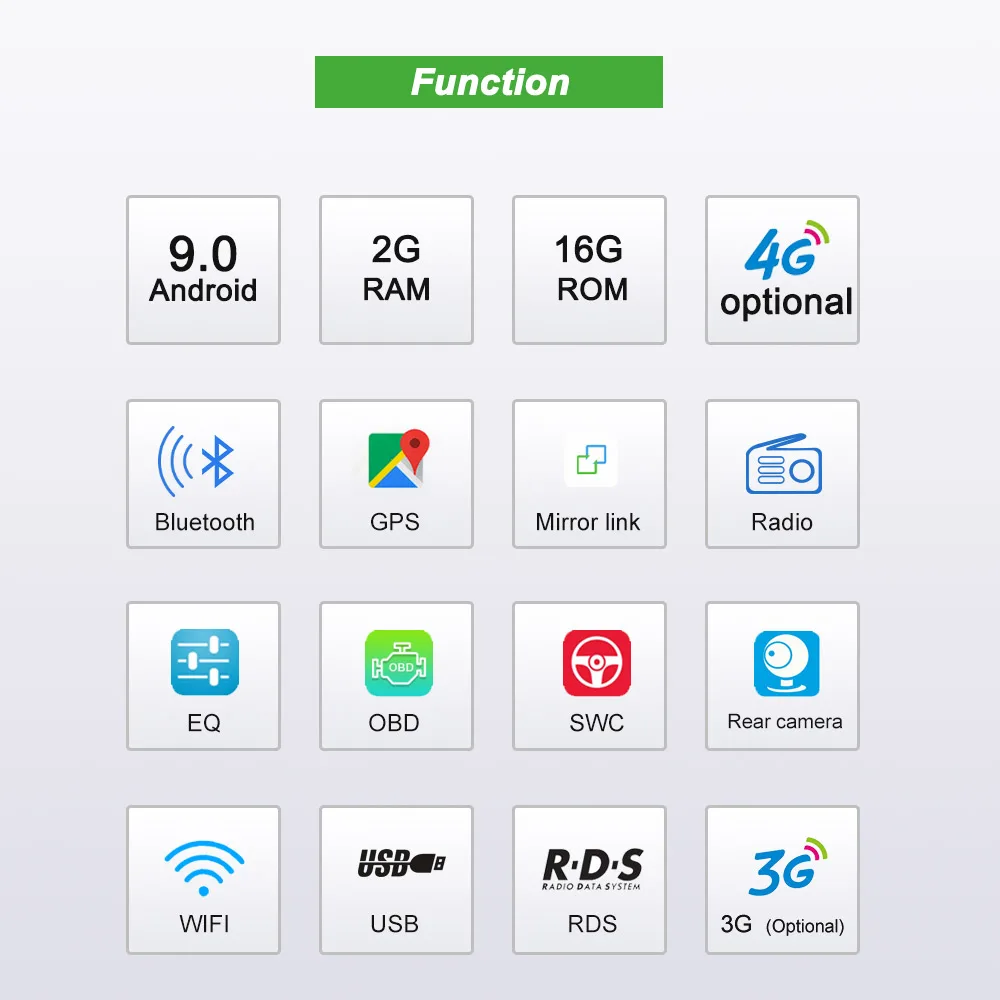 ОС Android 9.0 поддержка 3G/4G (опционально), WIFI, Bluetooth, вход камеры заднего вида, gps-навигация, AUX;USB, язык: английский, японский, немецкий, испанский, французский, португальский, итальянский и т. Д. Тип установки: din Размер аппаратного процессора: 4 ядра RAM: 2G ROM: 16G гладкий и быстрый реакционный экран, захватывающий и мультисенсорный экран, высокое разрешение, Радио Встроенный RDS Радиоприемник, функция радиочастотной области: Fm87,5-108 МГц; AM522-1620KHz мультимедийные параметры Формат музыки: MP3,WMA,AAC,RM,LFAC Fomat: JPG,BMP,JEPG,GIF,PNG совместимый диск: MP4,MP3,MP2
