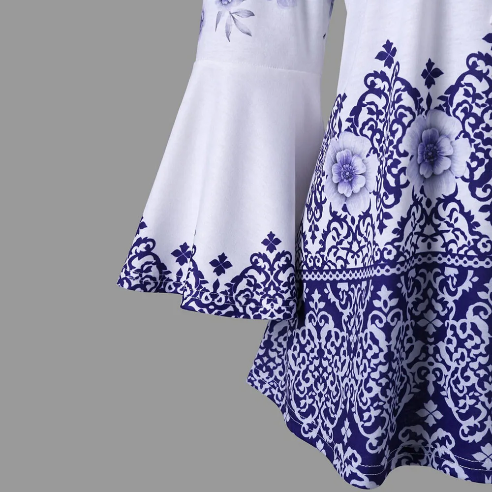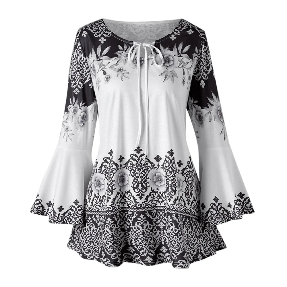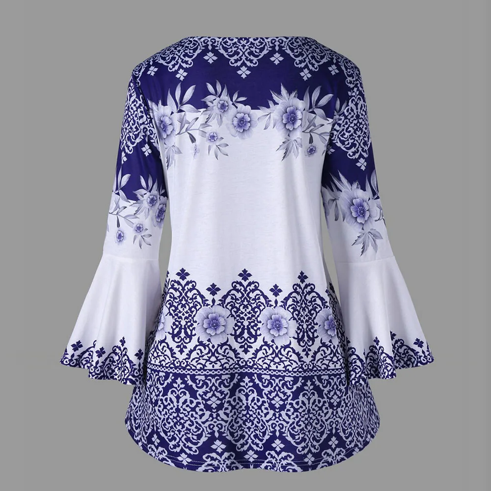 Женская туника-блузка 2021, модные женские блузки с расклешенным рукавом и принтом, рубашки с вырезом под ключ, Женская Зимняя Блузка