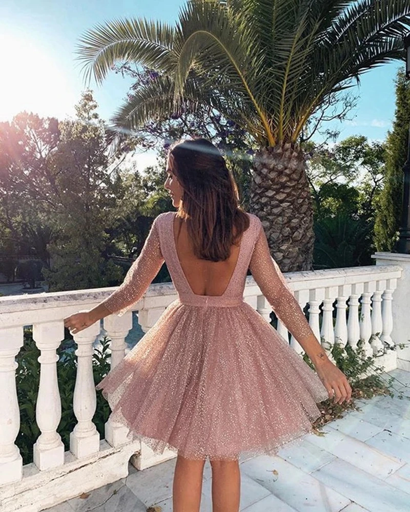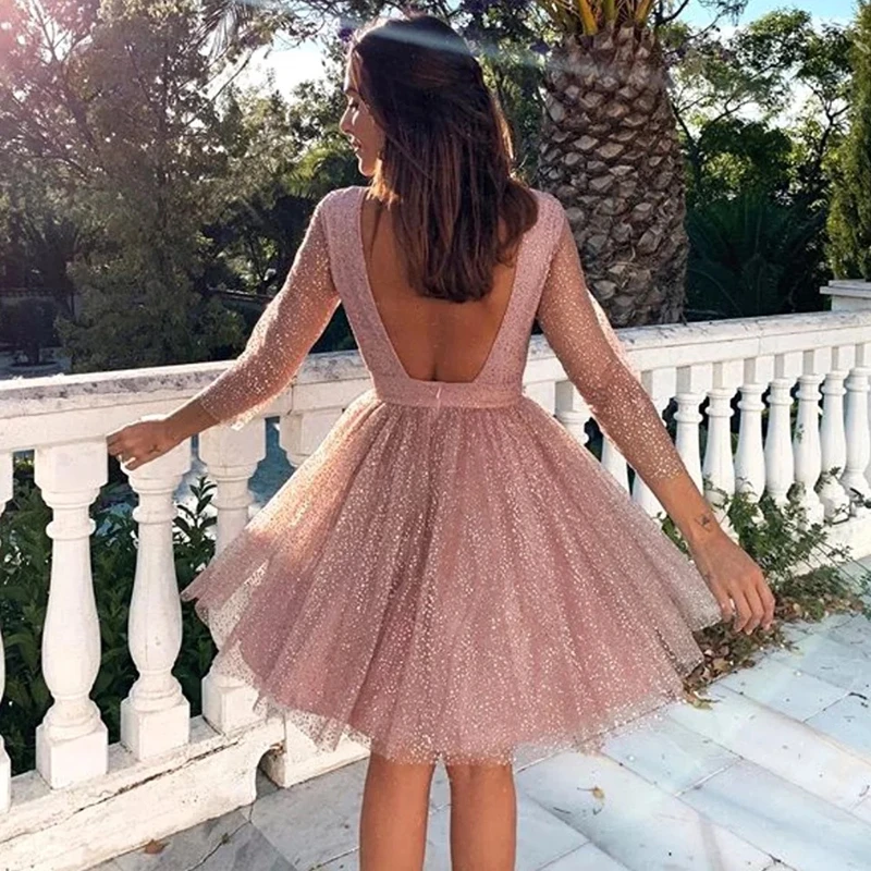 Блестящие Розовые платья для встречи выпускников 2021, короткое блестящее вечернее платье до колена с длинным рукавом и круглым вырезом для выпускного вечера, расшитое пайетками, с открытой спиной