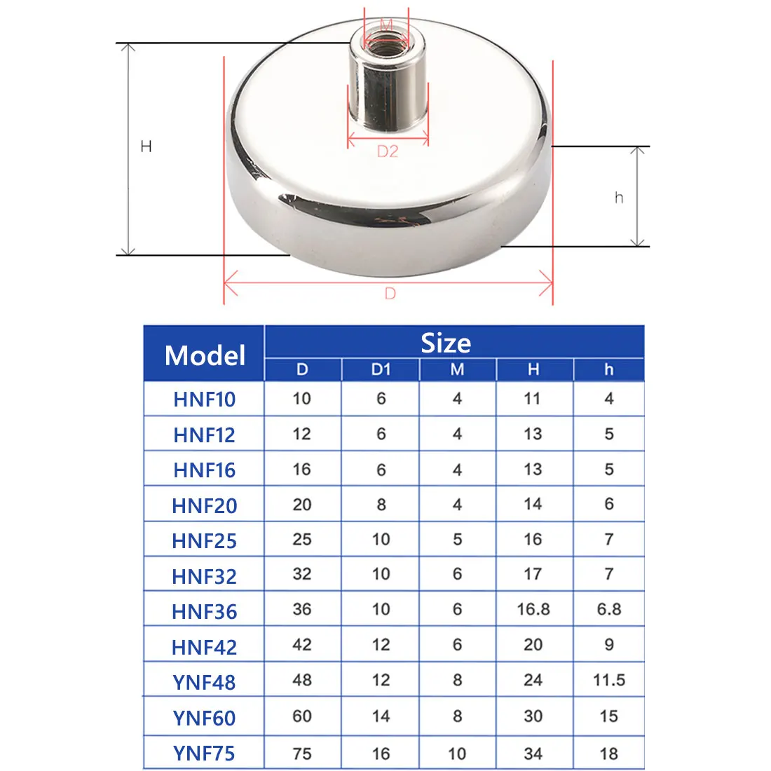Характеристики: Материал: нержавеющая сталь NdFeB + 304 Цвет: серебристый Максимальная тяговая сила: HNF10: 1,5 кг HNF12: 2 кг HNF16: 8 кг HNF20: 12 кг HNF25: 25 кг HNF32: 34 кг HNF36: 50 кг HNF42: 66 кг HNF48: 78 кг HNF60: 160 кг HNF75: 270 кг См. Таблицу для конкретных размеров