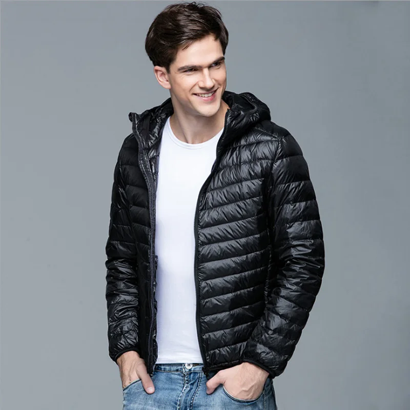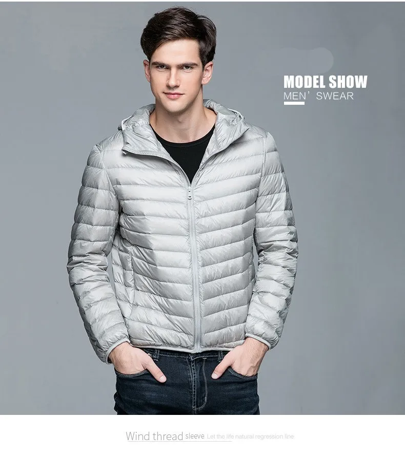 Мужской тонкий пуховик с капюшоном, светильник белом утином пуху