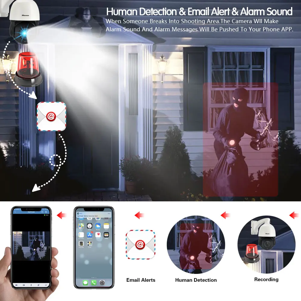Когда кто-то ворвется в область съемки, камера сделает звуковой сигнал и сигнал тревоги будет передвинут в приложение вашего телефона. И когда он обнаруживает движение, 4 белый светодиодный светильник s будет светильник, показывая вам цвет ночной сцены.