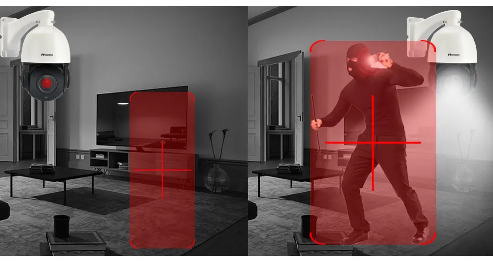 Когда человек проходит через зону сигнализации, камера обнаруживает движение человека. В то же время, 4 белый светодиодный светильник s будет светильник, чтобы показать ночной цвет.