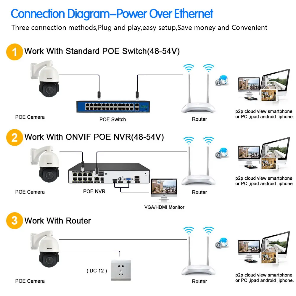Нет дополнительных кабелей питания или адаптеров, просто подключив ip-камеру к NVR с помощью одного кабеля, вы можете легко завершить установку без знания о компьютере или сети и начать наслаждаться супер простым мониторингом среди вашего смартфона, планшета или ПК.
