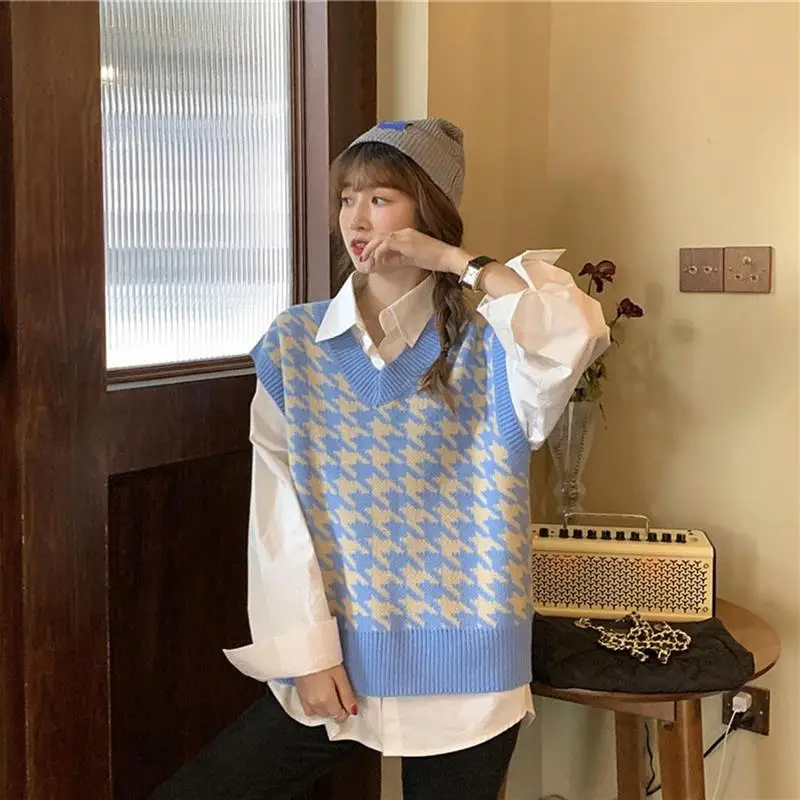 Свободный клетчатый свитер с рисунком гусиная лапка, жилет, Осенний Женский пуловер с V-образным вырезом, безрукавка, женские топы