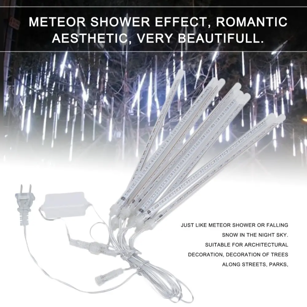 Особенности:Эффект метеоритного дождя, романтическая эстетика, очень красивый.Как метеоритный дождь или падающий снег в ночном небе.Подходит для архитектурного украшения, украшения деревьев вдоль улиц, парков, украшения, декоративной реки, городского ночника.Водонепроницаемый, пыленепроницаемый, устойчивый к коррозии.Низкое энергопотребление, энергосбережение. Характеристики:Цвет светильник: белый, синий, теплый белый, розово-фиолетовый, разные цветаТип штекера: США, ЕС, Великобритания, Австралия