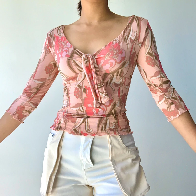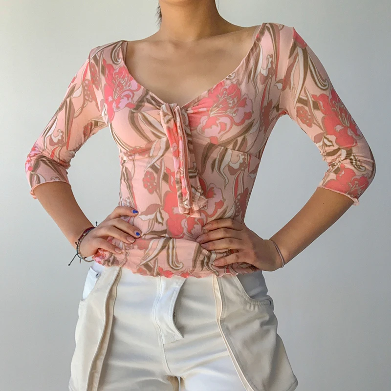 Y2K сказочная гранж-розовая футболка 90-х годов винтажная первоклассная Осенняя футболка элегантная женская на шнуровке с V-образным вырезом укороченный топ Женская одежда с графическим принтом