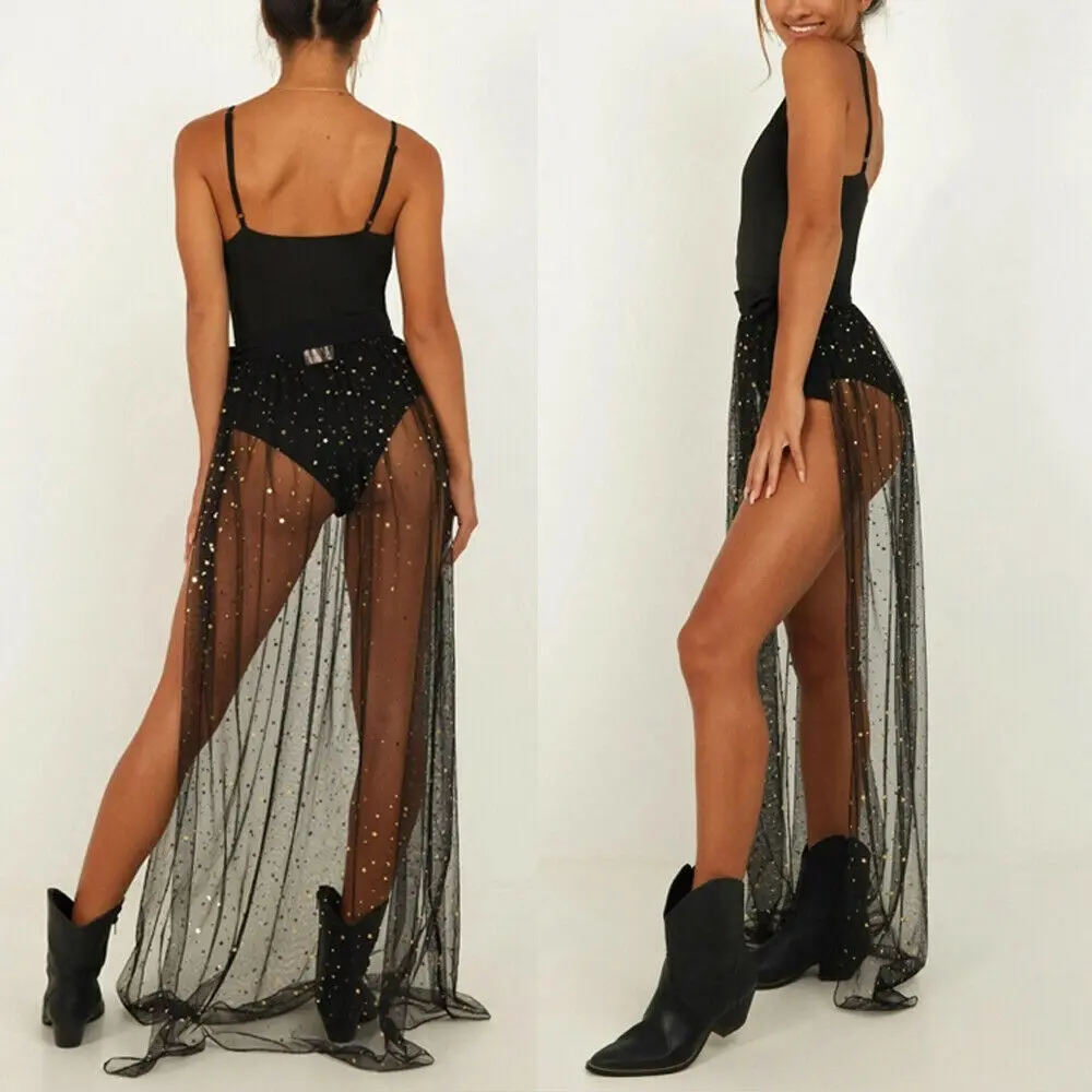 Женская купальная одежда, накидка на бикини, блестящая пляжная Длинная накидка с блестками, сексуальная прозрачная сетчатая Макси-юбка с запахом, платье-саронг Парео макси