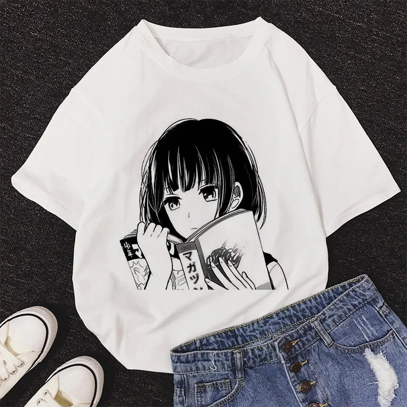 Футболка женская с графическим принтом и круглым вырезом, белый топ в японском стиле аниме, с рисунком кавайной девушки, в стиле Харадзюку