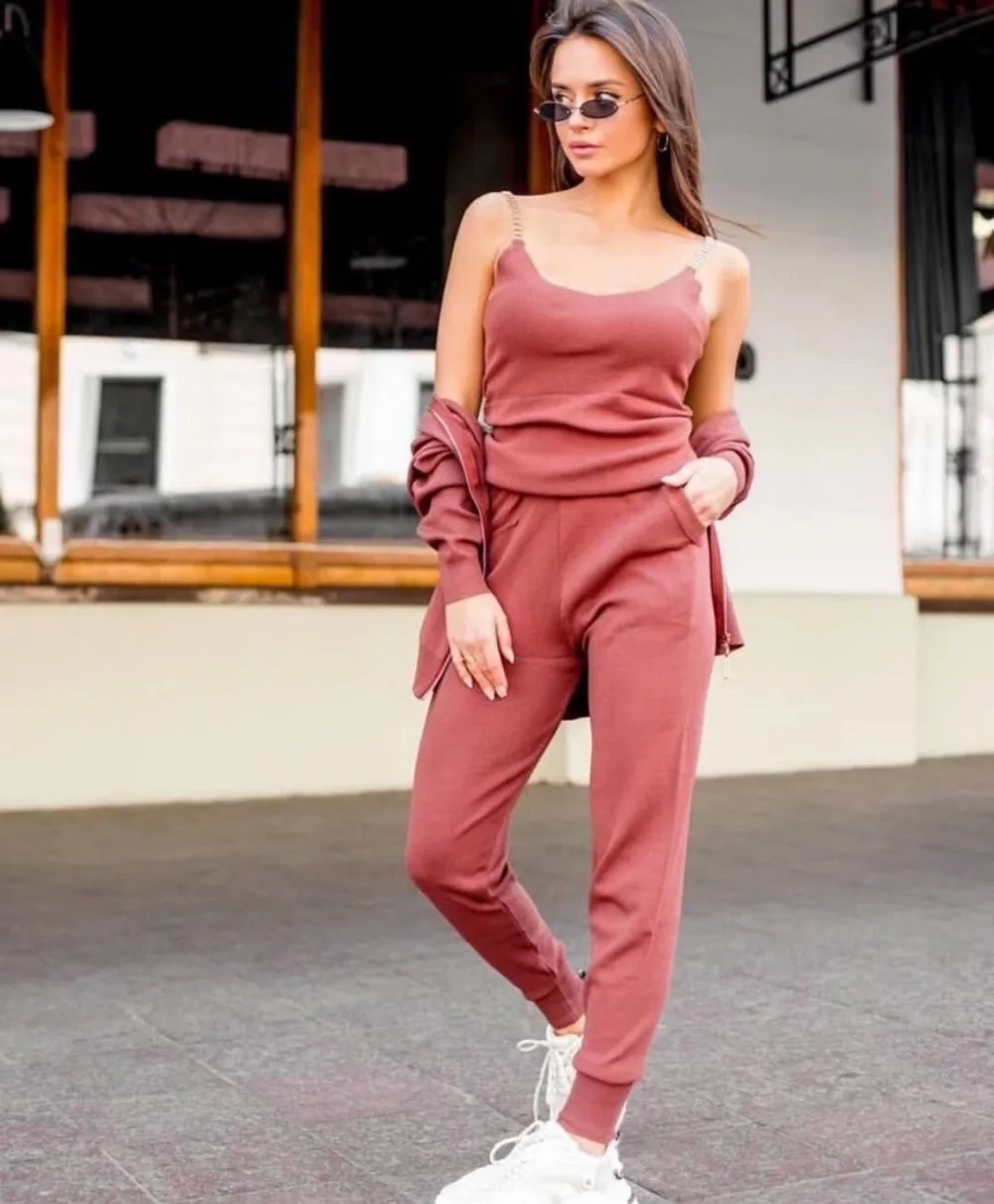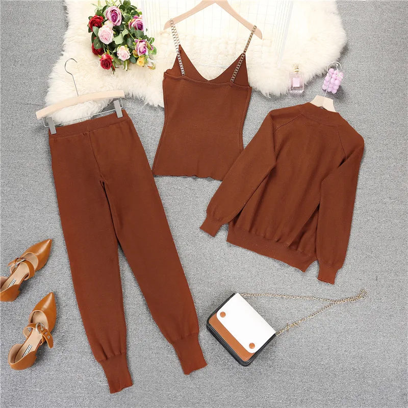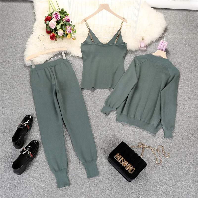 Женский трикотажный кардиган на молнии + жилет с цепочкой и брюки, ...