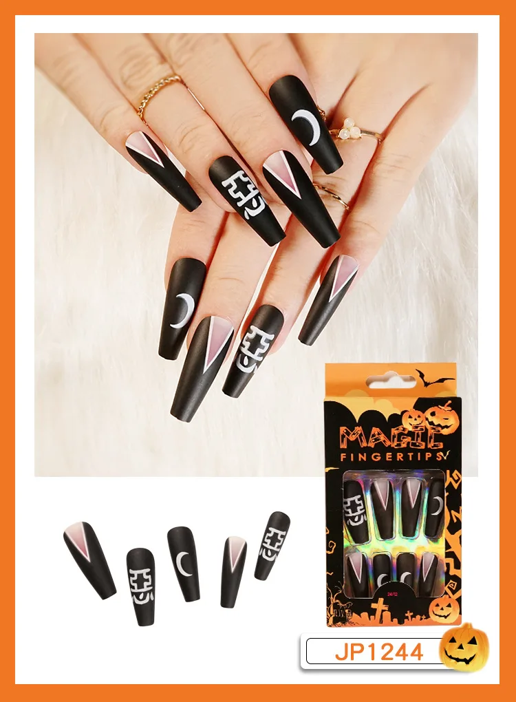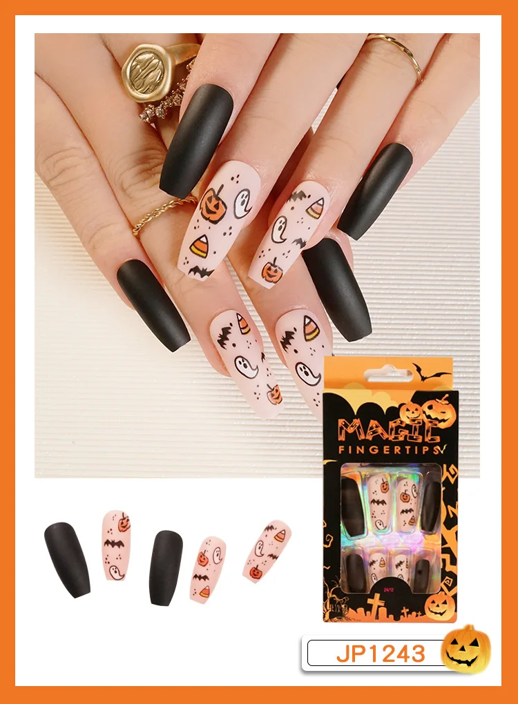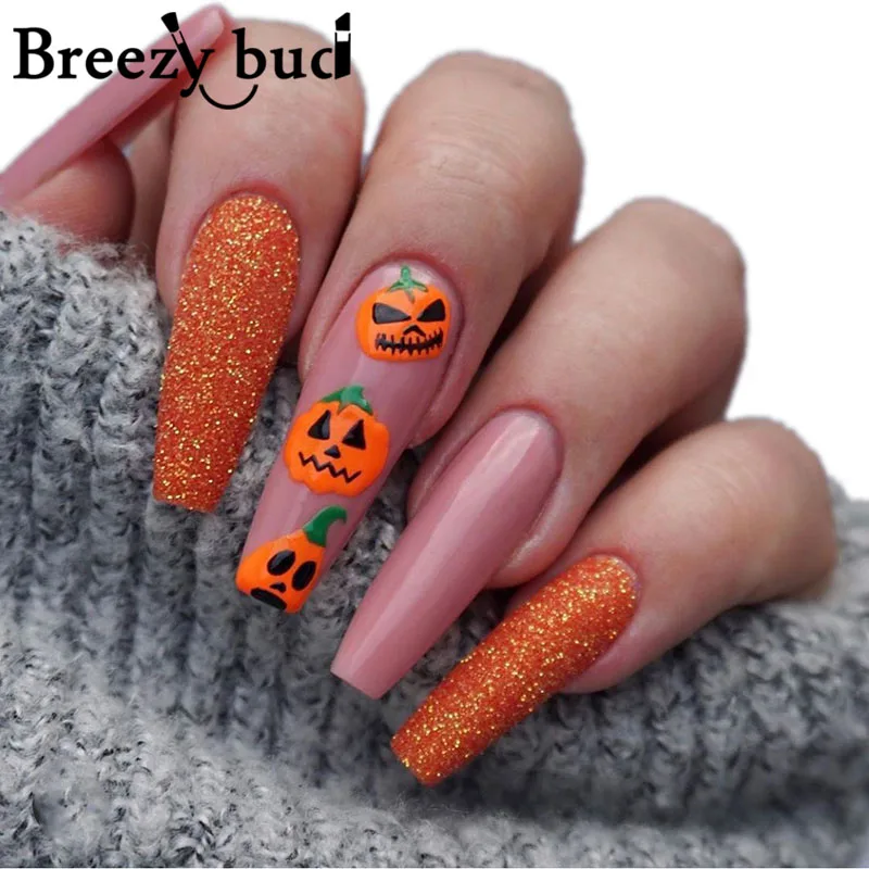 Блестящие накладные ногти на Хэллоуин с клеем, накладные ногти в виде тыквы в стиле панк, французские гробные накладные ногти, искусственный пресс, инструменты для дизайна ногтей