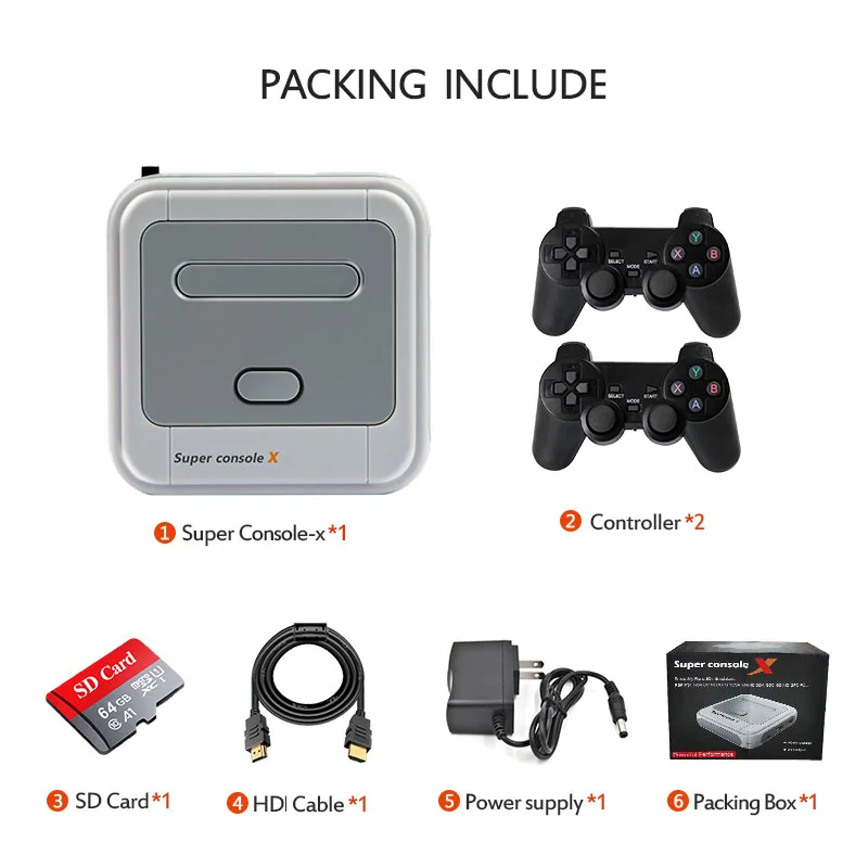 • Супер КОНСОЛЬ * 1 • Игровой контроллер * 2 • Sd-карта * 1 • Кабель HDMI * 1 • Адаптер питания * 1 • Упаковка * 1 • Док-станция USB * 1