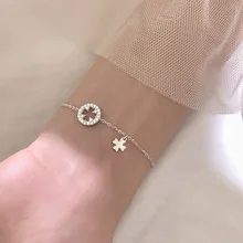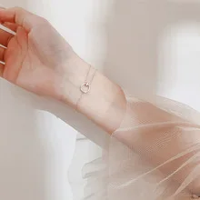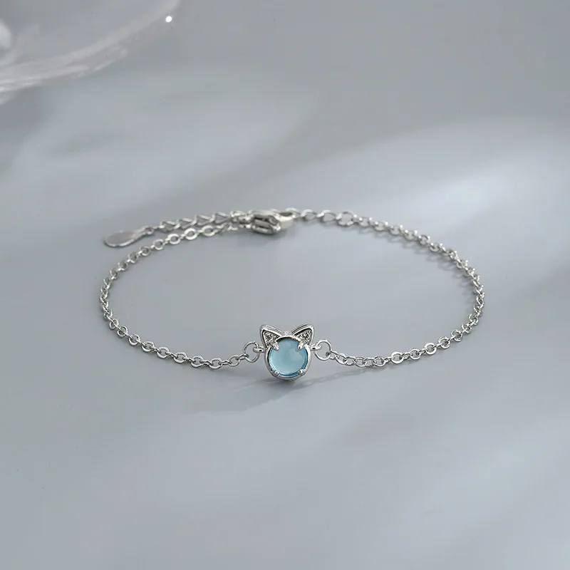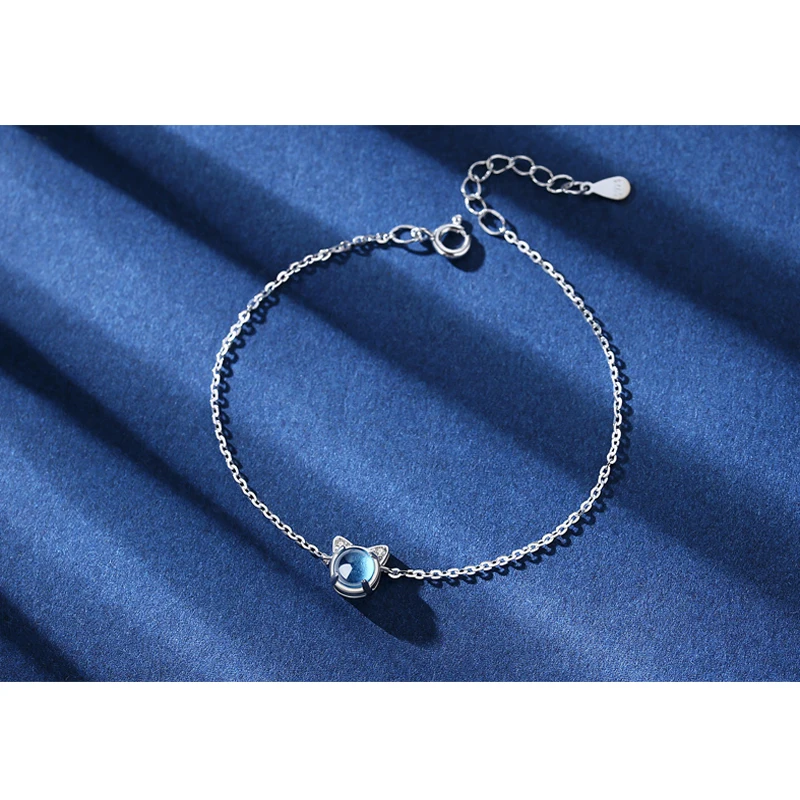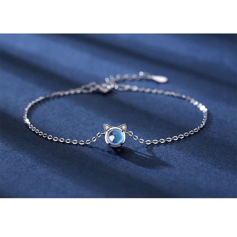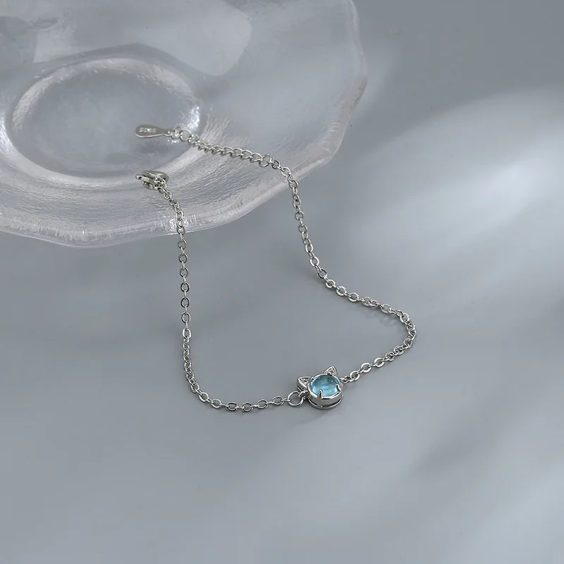 Браслет-цепочка женский из серебра 925 пробы с синим кристаллом в виде кошки