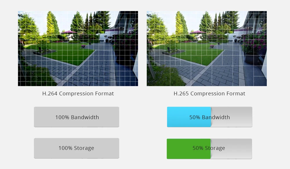 Благодаря технологии сжатия видео H.265 больше места памяти будет сохранено по сравнению с H.264 при хранении тех же видео. Между тем, он не только передает более четкое и плавное видео, но и экономит больше места для хранения дисков, таким образом, экономит затраты на покупку дополнительного жесткого диска.