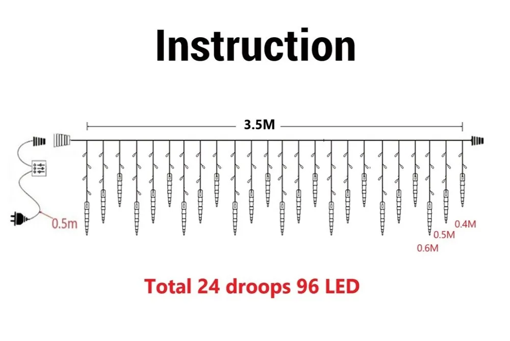 3,5 м X 0,6 м 96LED в комплектеНапряжение: штепсельная вилка европейского стандарта AC220VКоличество капель: 24 струны линии капель.Количество СВЕТОДИОДНЫЙ: 96 шт.Размеры: 3,5 м (Ш) х 0,4 м (H)/0,5 м (H)/0,6 м (H)Материал: ПВХ кабель и медная проволокаОт вилки до разъема: всего 4,5 метров в длинуЦвет кабеля: прозрачный белый