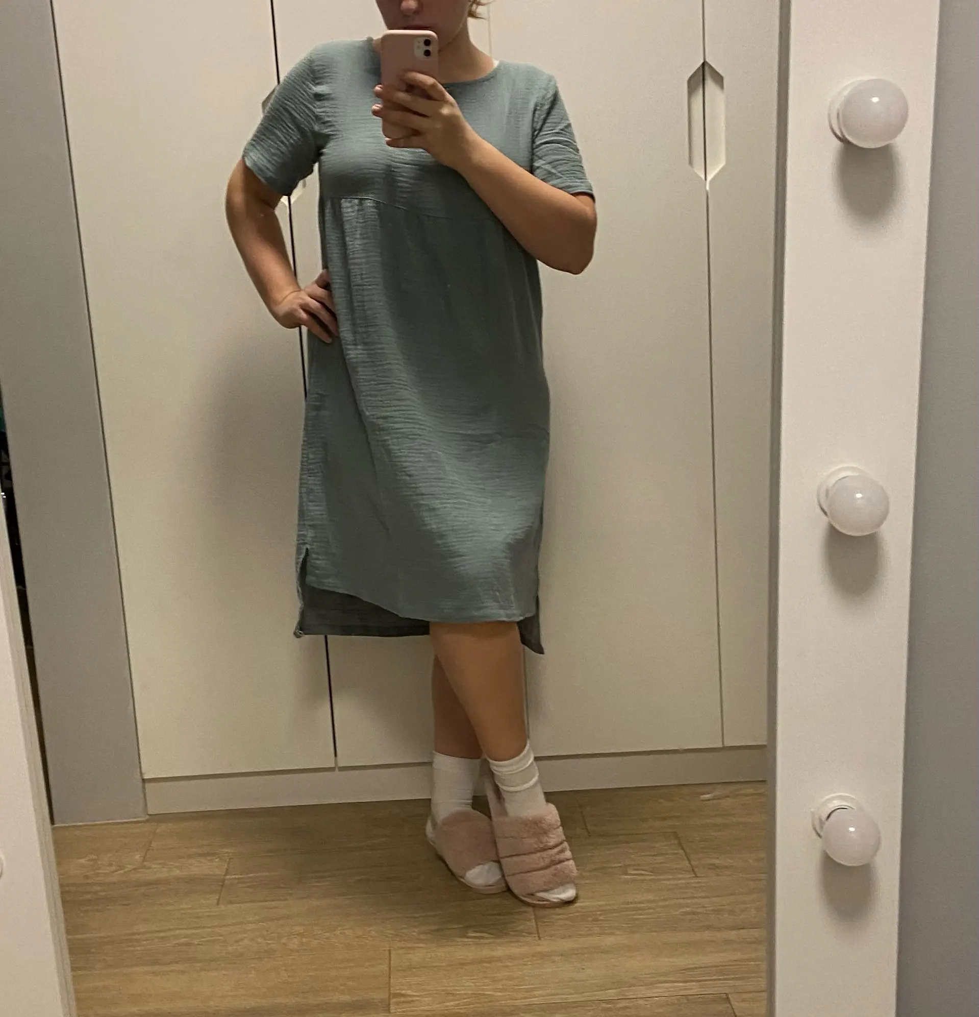 Платье очень хорошо выглядит и сидит. У меня верх S, а низ - М. Я взяла L размер. Сидит свободно. В плечах как раз. Цвет очень нежный. Ткань не просвечивает, но в то же время платье очень невесомое. На лето супер. Кое где торчат нитки, но это поправимо.