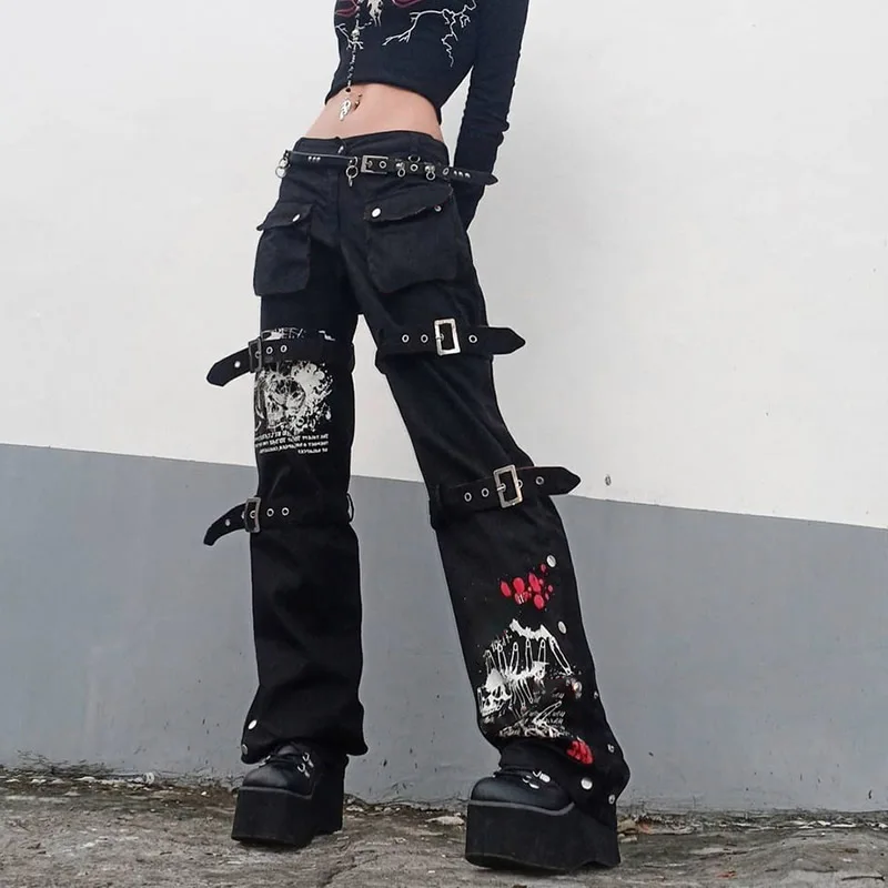 Брюки-карго Y2K в стиле панк, уличные штаны из денима с принтом черепа, с пряжкой, в готическом стиле, темные брюки с завышенной талией, в стиле Харадзюку
