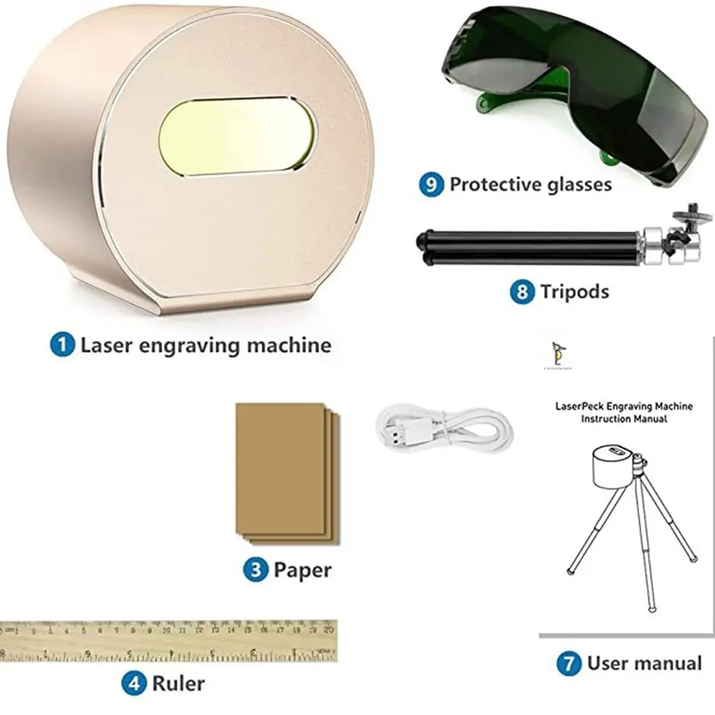 1 * лазерный гравер1 * USB кабель1 * Штатив1 * очки1 * Адаптер питания1 * Мини-набор гравировальных материалов