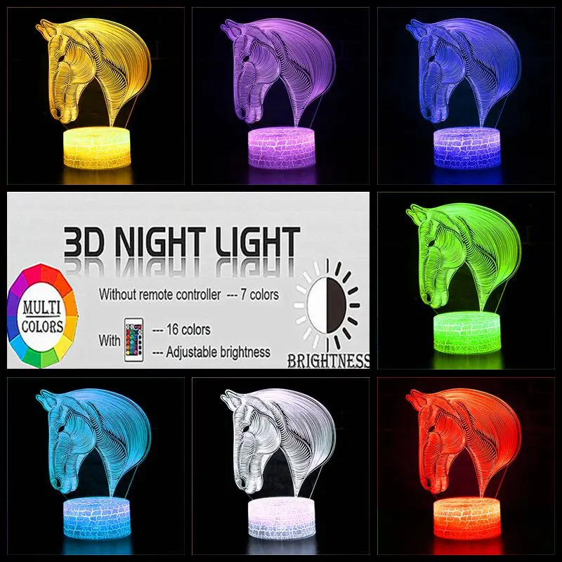 Голографический светодиодный ночсветильник с головой лошади в виде животного, настольная лампа с изменением цвета, украшение для детской спальни, подарок для игр