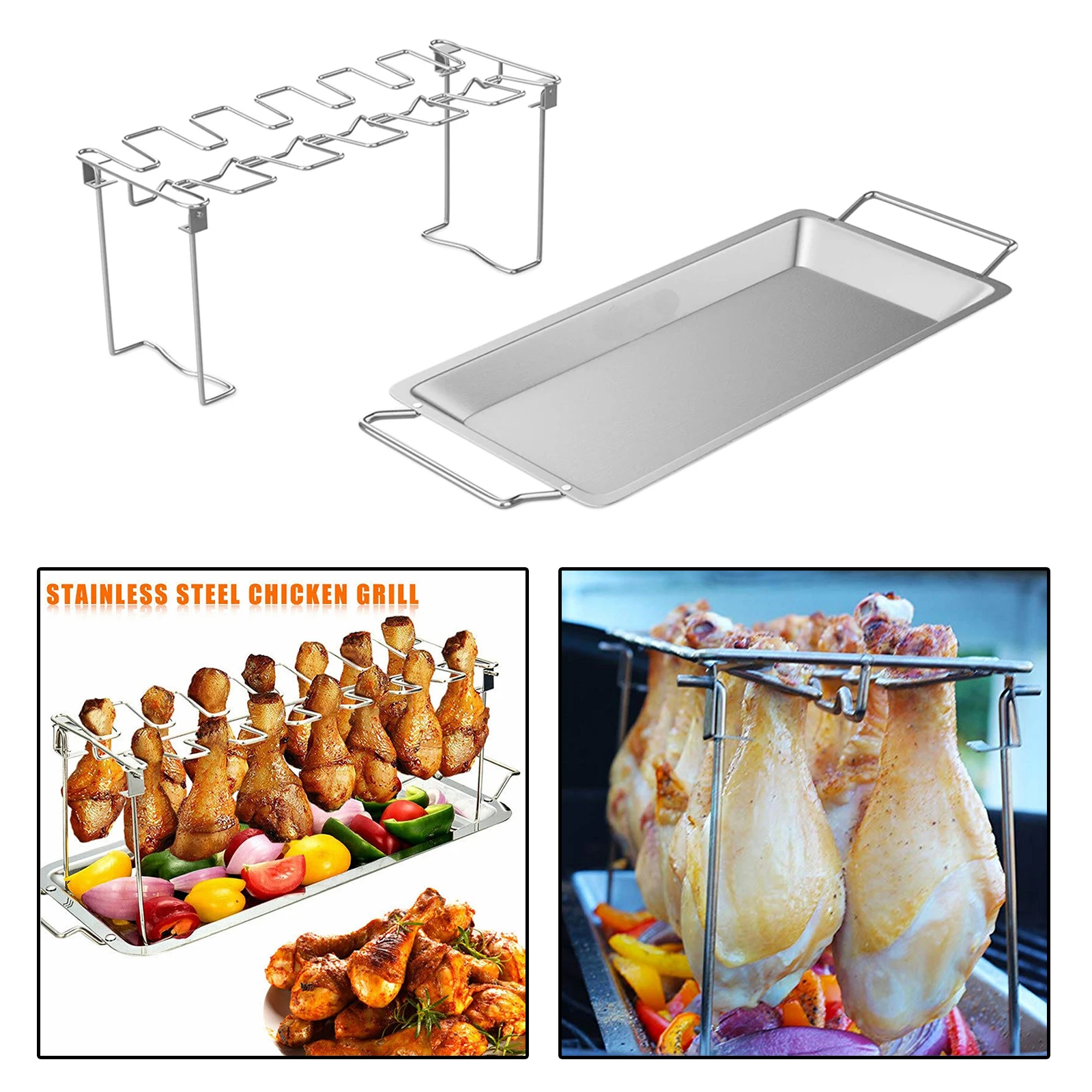 Стойка для крыла куриных ножек изготовлена из нержавеющей стали, прочная конструкция и долговечность,Стойка для куриных барабанов с капельной кастрюлей, сковорода является аксессуаром для барбекю, который подходит для хранения некоторых мелких предметов, таких как крылья, овощи на палочке и шашлыке.Курятник для барбекю может держать крылья, ножки или барабанные палочки и может использоваться на гриле, духовке.Складная подставка, легко хранить и переносить, вы можете взять ее на открытый барбекю вечерние.Посудомоечная машина безопасная, легко моется, после использования, пожалуйста, постирайте ее в теплой воде и высушите.