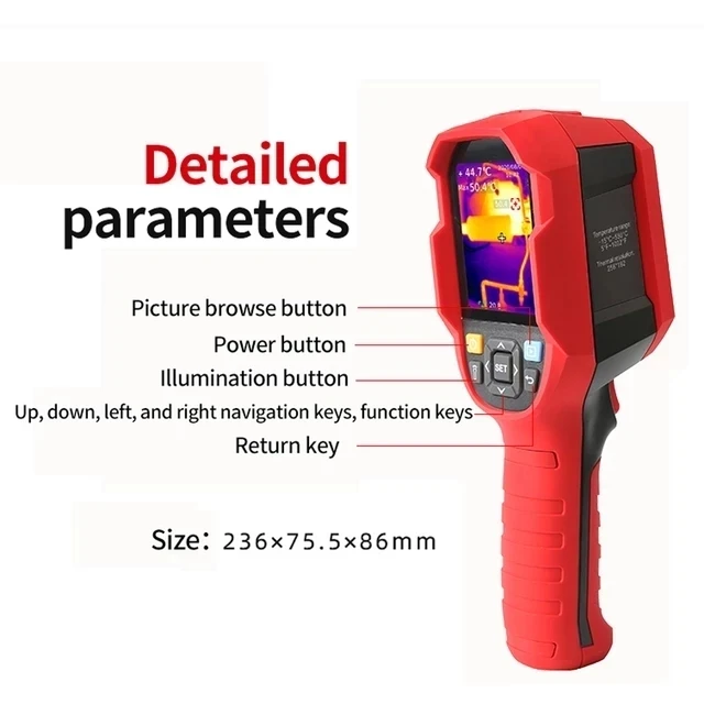 Описание товара1. Диапазон измерения температуры-10 °C ~ 400 °C2. Точность измерения температуры ± 2 °C или ± 2%3. Отслеживание температуры в центре при высоких и низких температурах4. Экран: 2,8 "TFT LCD5. Время использования не менее 6 часов6. 5 палитр белого горячего, красного, голубого, радужного, железного красного7. Степень защиты IP658. Программное обеспечение для анализа ПК9. Сопротивление падению: 2 м10. Сертификация CE