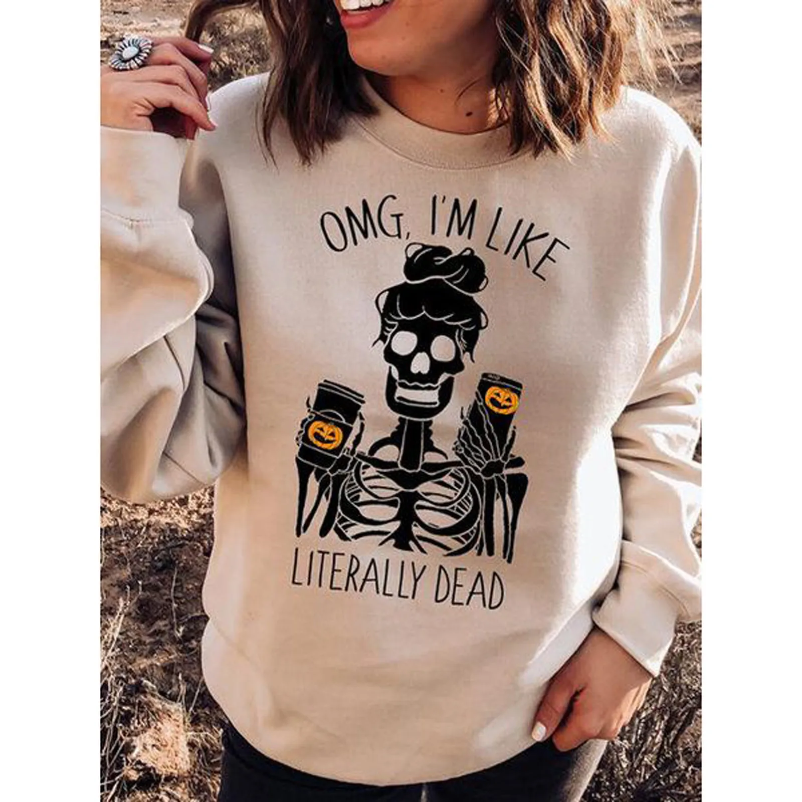Толстовка женская с круглым вырезом, свитшот с забавным принтом черепа, тыквы, кофе, аниме, повседневный Свободный пуловер, кофта на Хэллоуин