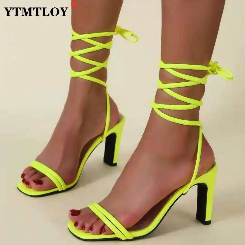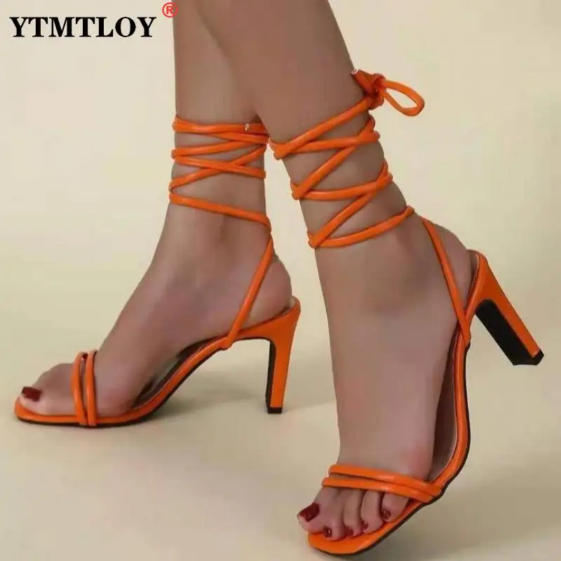 2021 летние модные оранжевые женские сандалии с перекрестными ремешками на щиколотке пикантные женские туфли на шнуровке с квадратным носком для вечерние на высоком каблуке