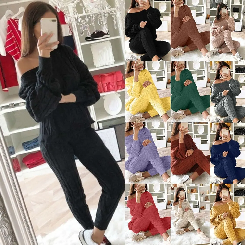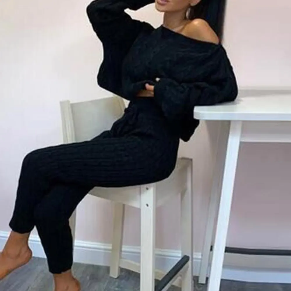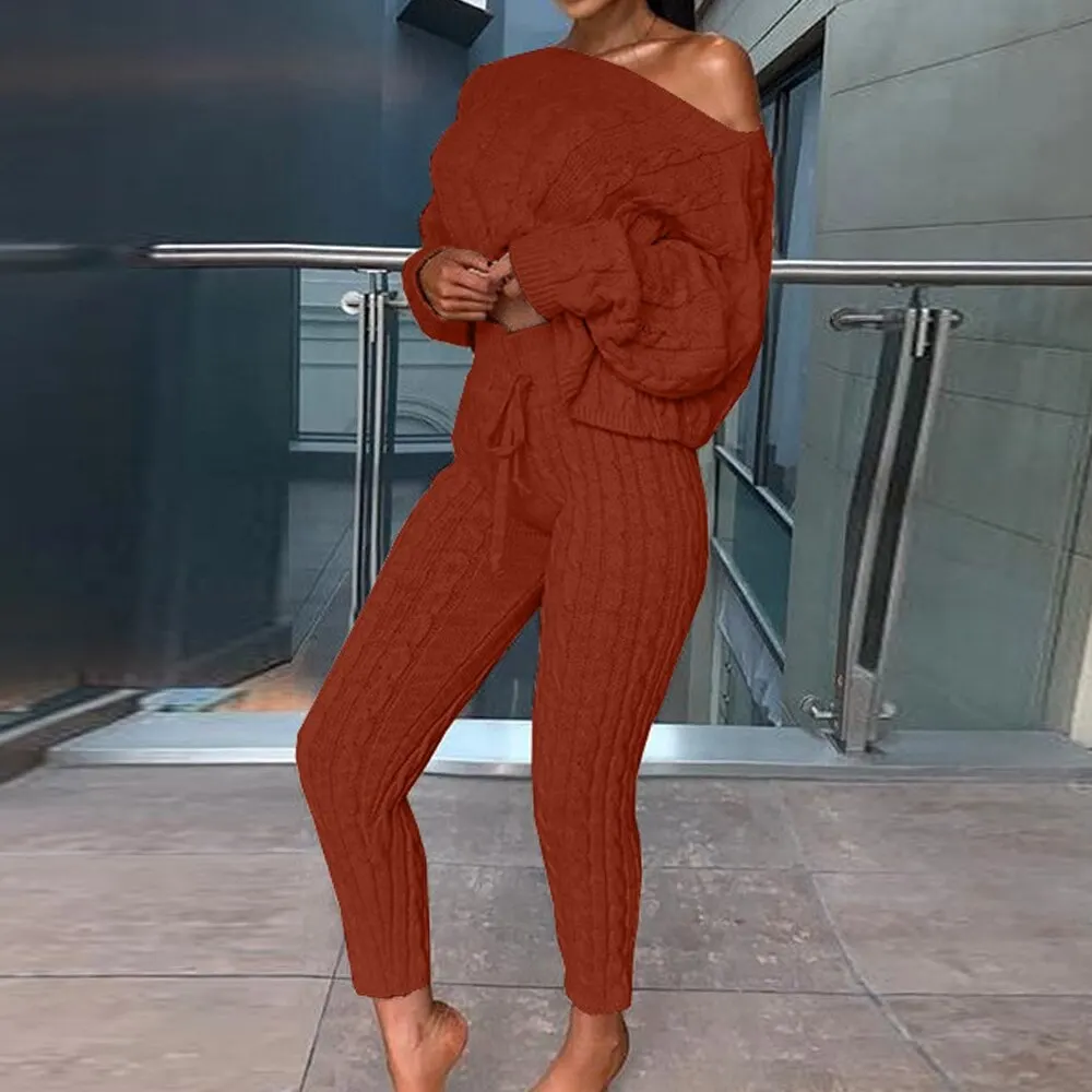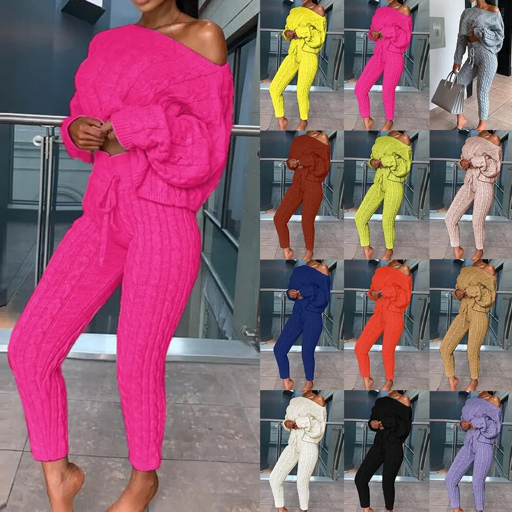 2Sweater Top+Elastic Waist Pant Knitted Suit Women