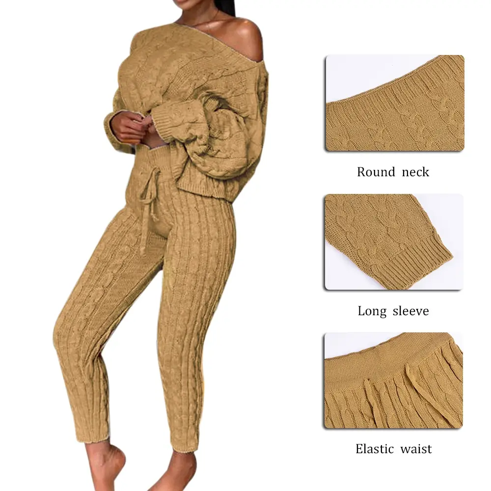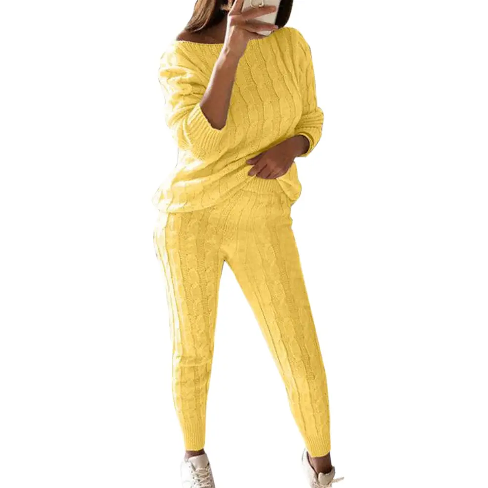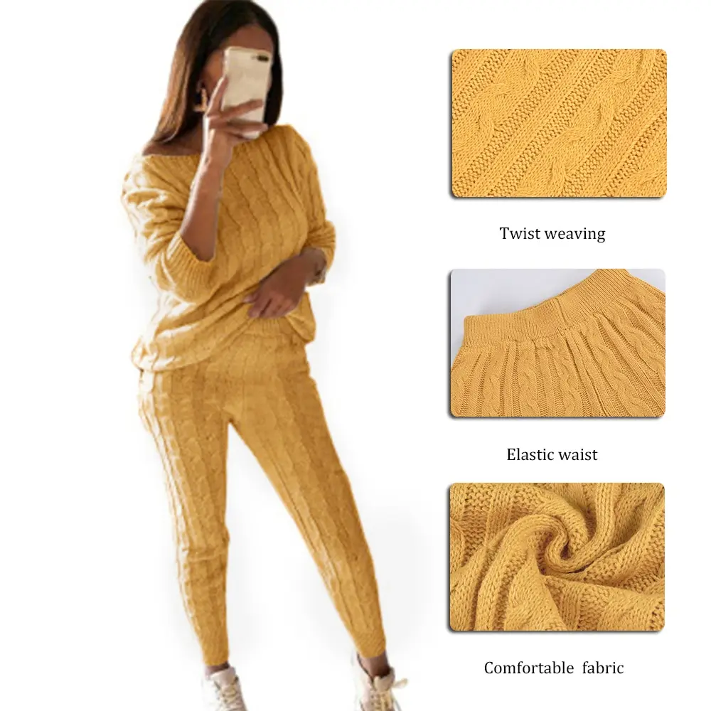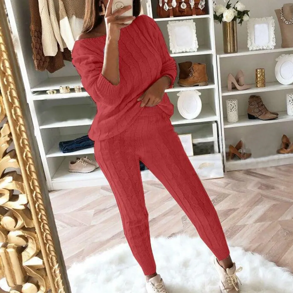 2Sweater Top+Elastic Waist Pant Knitted Suit Women