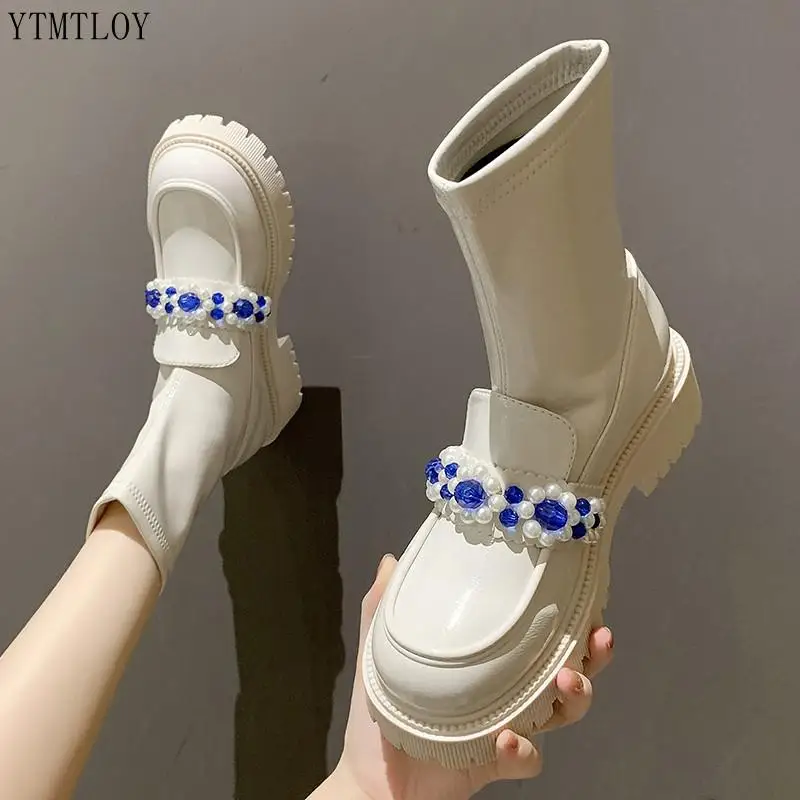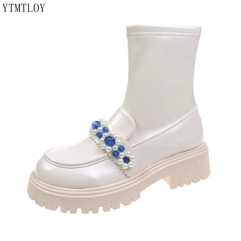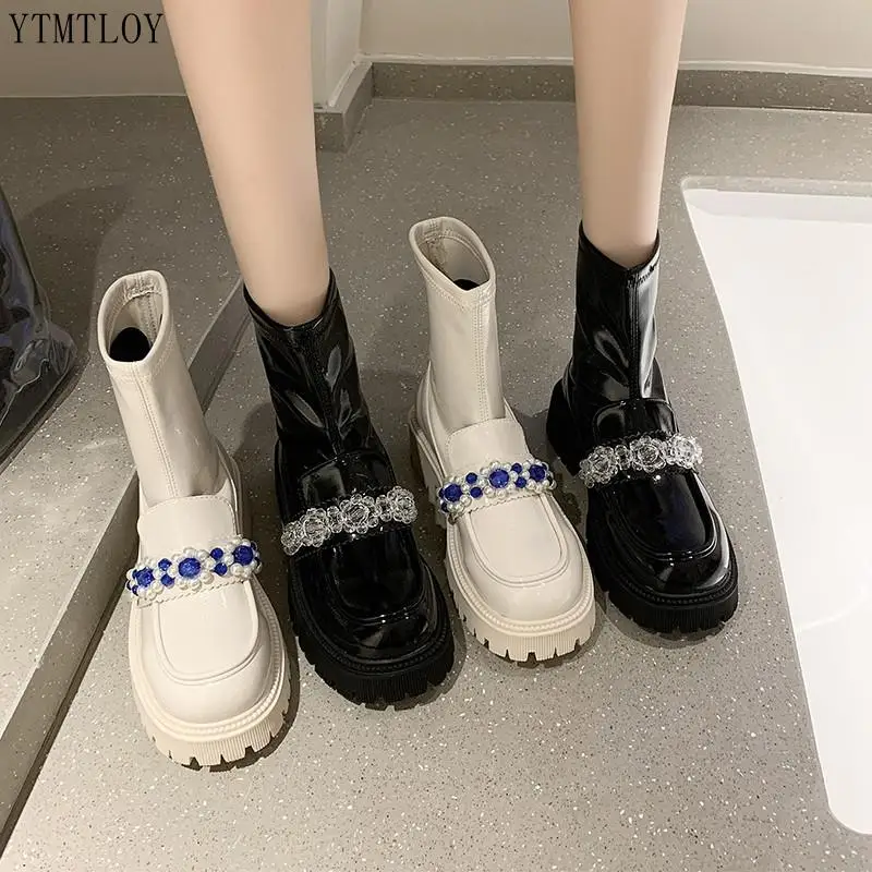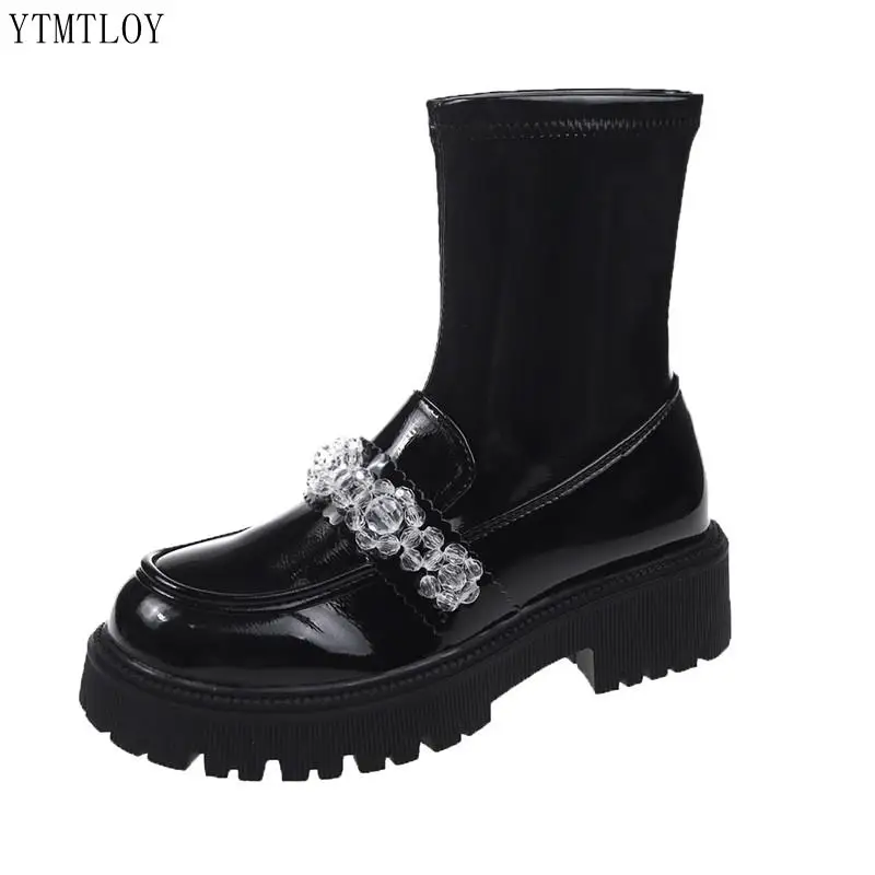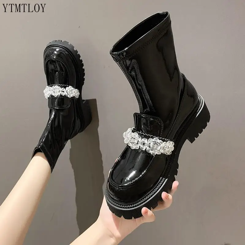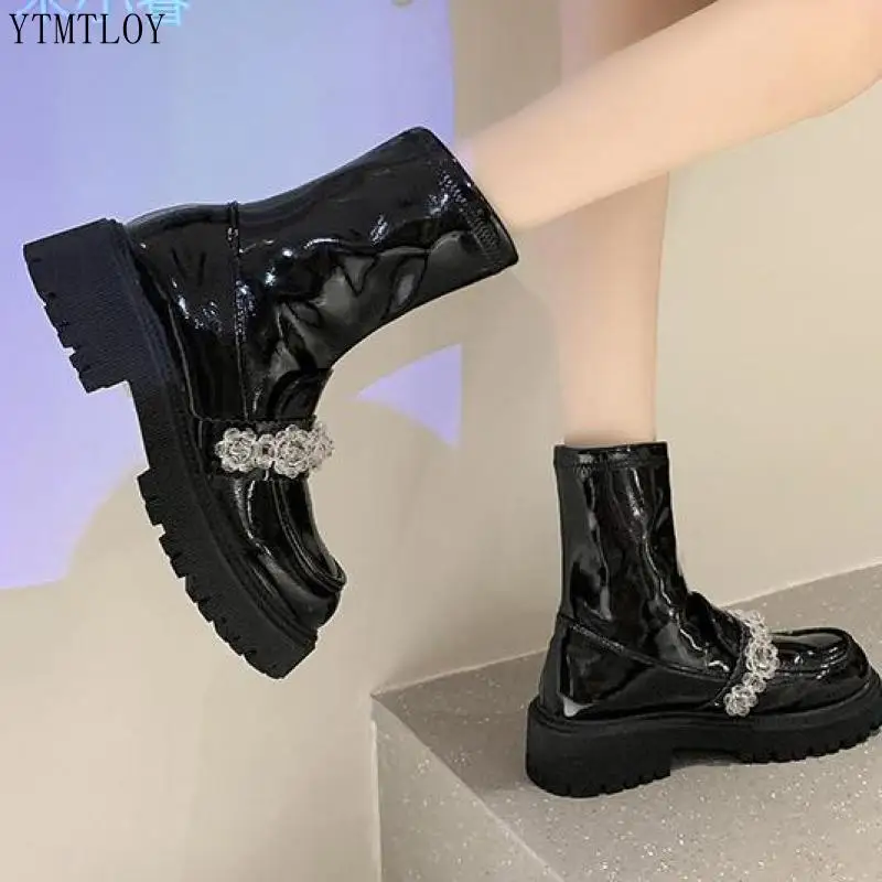 Женские ботильоны на цепочке с цветочным принтом и кристаллами, ботинки на высоком блочном каблуке с круглым носком, кожаная обувь, новинка 2022, зимние женские ботинки Ytmtloy без застежек