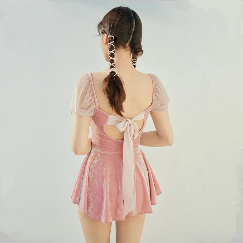 Женский слитный купальник Ousefu розового и белого цветов с юбкой и глубоким вырезом, свободный купальник со шнуровкой, пляжная одежда для спа и серфинга, женский купальный костюм