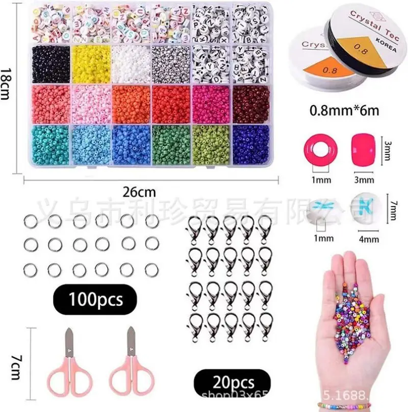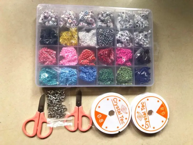 В том числе:20 цветов 10000 шт 3 мм бисер+ 4*7 мм 200 шт буквенных Бусин + аксессуарыСумка для аксессуаровЗастежка-лобстер 20 шт.100 шт открытая петля1 рулон струны1 шт. ножницы