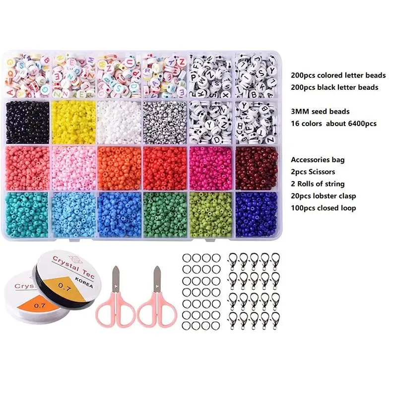В том числе:16 цветов 6400 шт 3 мм бисер+ 400 шт буквенных бусинСумка для аксессуаровЗастежка-лобстер 20 шт.100 шт открытая петля2 рулона струны2 шт. ножницы