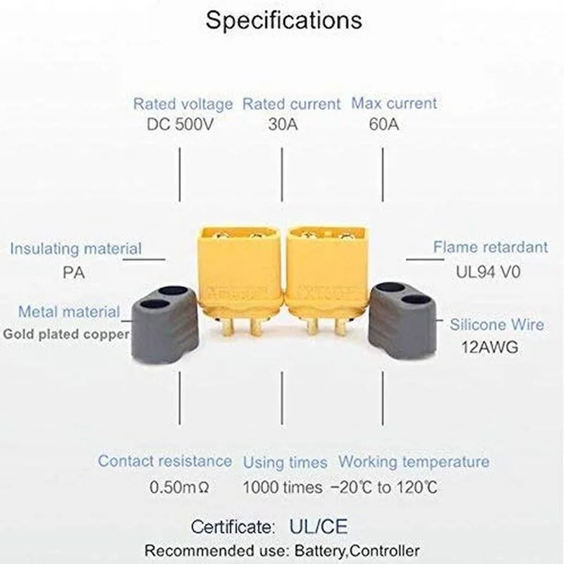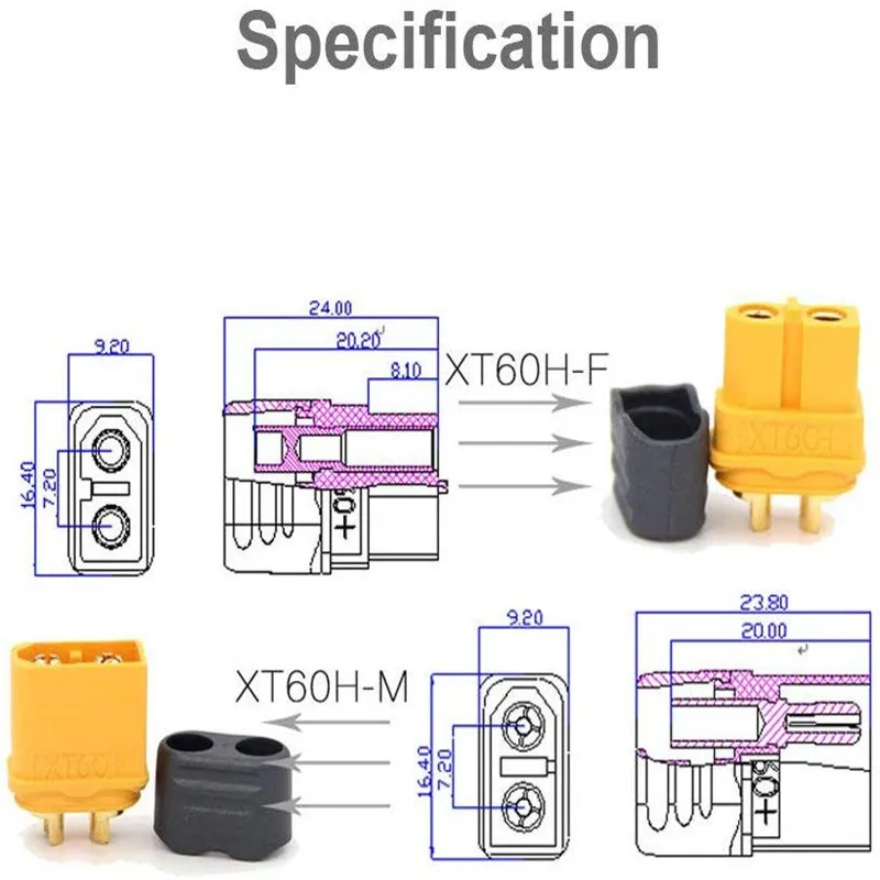 10 пар conectores xt60h feminino e masculino de alta qualidadePara rc lipo baterias drones aviыes carros veiculosConectores atuais da bala de manipulaçao de 60 ampéres, terno para a aplicaçao atual de 90-120aМатериал: de alta temperatura do nаilon, metade extreme aberta, mais fаcil para soldarProtegido para evitar curto e inversão de polaridade Especificaço:Nome Do artigo: XT60HМатериал: cobre banhado a ouroМатериал: nаilon/paСопротивление интерна: 0.8mΩМакс. rc/mc: 60a/100aПесо: 7,72 г/псаForça de traçao/600: 3 кгСопротивление температуры: -20 ° c ~ 120 ° cRecomendar o uso: 1000 vezesRecomendar Cabo Spec. : 12AWGСпецификация Recomendar Solda. : 480 °C/4S Pacote Inclui:10 pces xt60h plugue masculino10 pces xt60h plugue fêmea