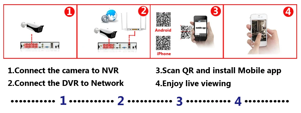 Простая настройка, всего 4 шага для просмотра мобильный телефон, просмотра видео в режиме реального времени из любого места и в любое время с помощью смартфона, стола или ПК с передовой технологией P2P, вы можете получить удаленный доступ к вашей системе за считанные минуты или меньше, нет необходимости в переадресации, удаленный доступ никогда не был таким простым!