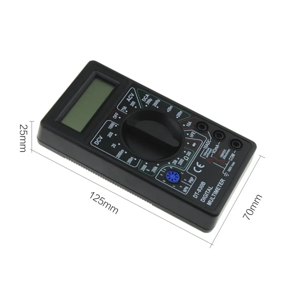 Характеристики:Модель: DT-830BЦвет: черный/желтый на выборКоличество дисплеев: 1999Диодный Тест: ДаТест hFE: ДаИндикация низкого заряда батареи: ДаАвтоматический дисплей полярности: ДаЗащита от перегрузки: ДаНапряжение постоянного тока: 200 мВ/2 в/20 в/200 В/1000 вНапряжение переменного тока: 200 В/750 ВТок постоянного тока: 200uA/2000uA/20mA/200mA/10AСопротивление: 200Ω/2K Ω/20K Ω/200K Ω/2000KΩПитание: аккумулятор 9 В (не входит в комплект)Размер изделия: 125X70X25 ммВес нетто продукта: 109 г