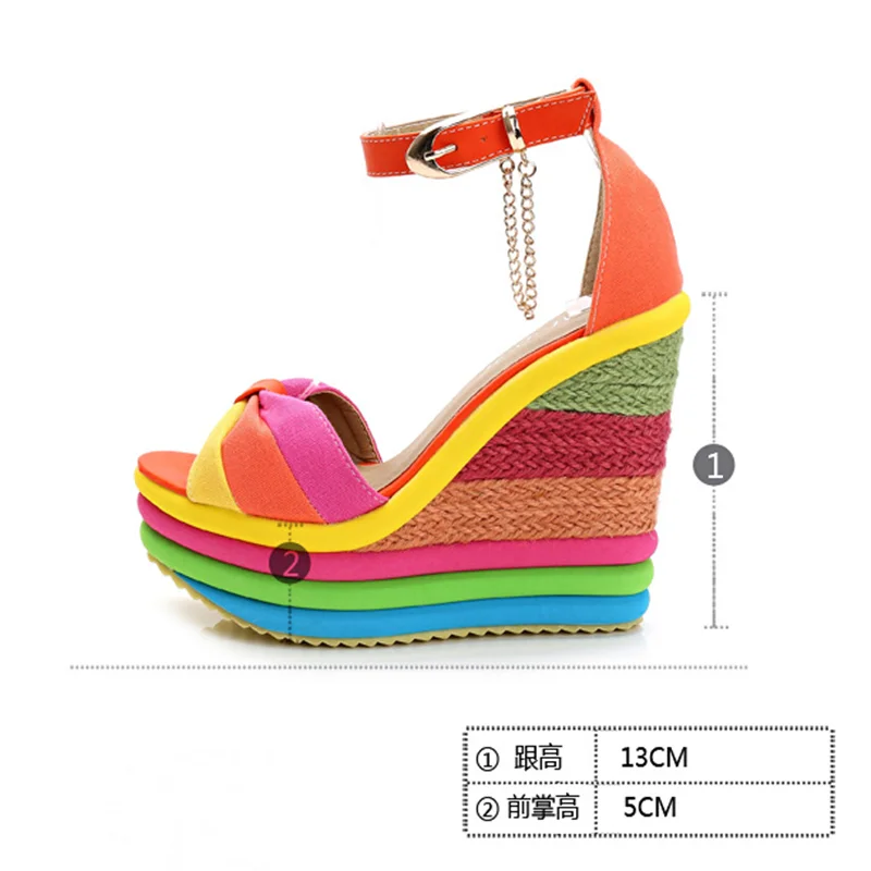 Женские сандалии на танкетке, разноцветные радужные туфли на платформе, женская обувь с ремешком на щиколотке и бантом, Новинка лета 2021