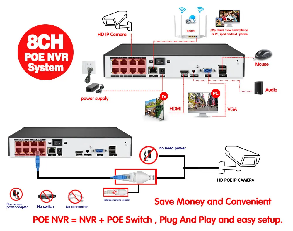 Никаких дополнительных силовых кабелей или адаптеров не требуется, просто подключив IP-камеру к сетевому видеорегистраторУ с помощью одного кабеля, вы можете легко завершить установку, не зная о компьютере или сети, и начать наслаждаться супер легким мониторингом среди вашего смартфона, планшета или ПК.Экономьте деньги и удобный POE NVR = переключатель NVR + POE, подключи и работай, простая настройка!