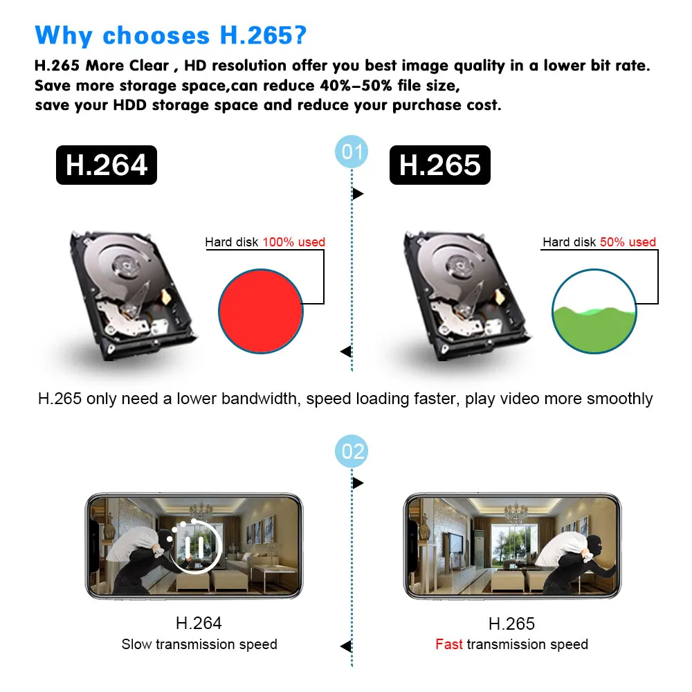Более четкое H.265, HD разрешение обеспечивает наилучшее качество изображения при более низкой скорости передачи данных. Сэкономьте больше места для хранения, вы можете уменьшить размер файла на 40%-50%, сэкономить место на жестком диске и снизить стоимость покупки.