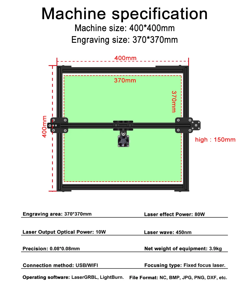Машина может быть совместима с различными зрелыми гравировальными программами, такими как LaserGRBL, LightBurn, поддержка Win XP / Win 7 / Win 8 / XP / Win 10, а также поддержка MAC system (LightBurn), формат гравировки файлов поддерживает NC, BMP, JPG, PNG, DXF и т. Д.