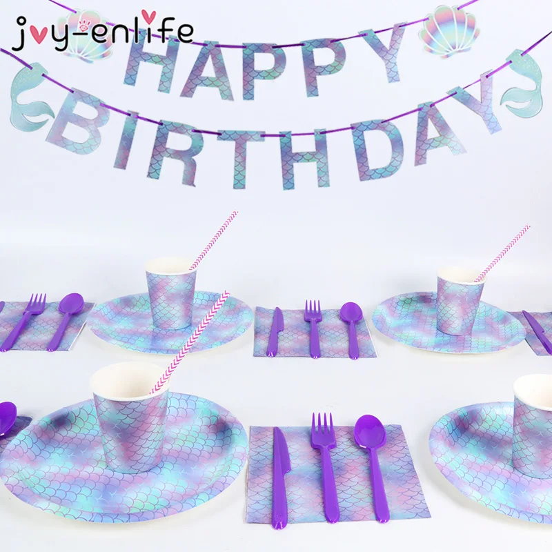 Набор украшений для вечеринки в честь Дня Рождения маленькой Русалочки, элегантные фиолетовые синие одноразовые тарелки, чашки для салфеток, свадебные украшения