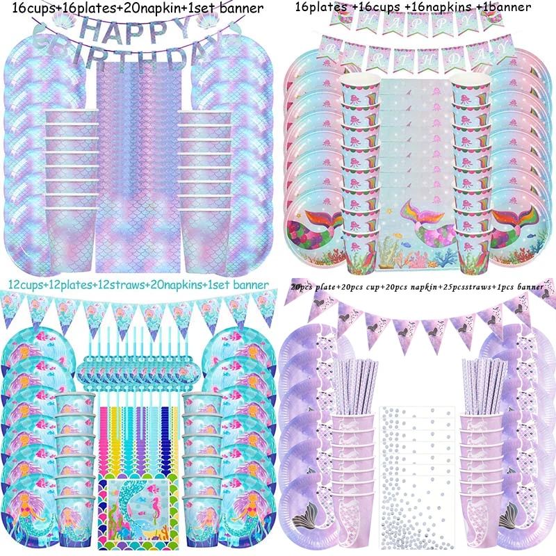 Набор одноразовой посуды для дня рождения русалки, салфетки, тарелк...