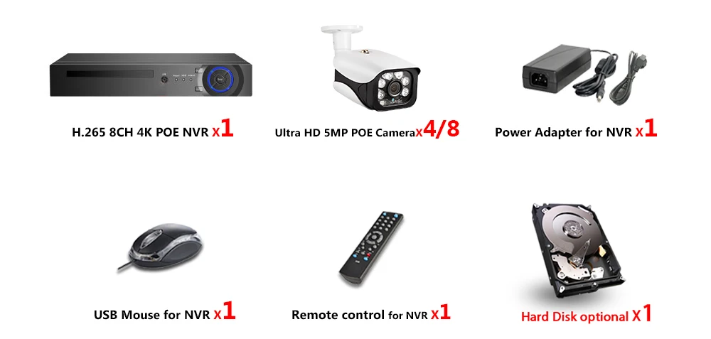 1 сетевой видеорегистратор 8CH 4K POE NVR;4/8 X HD POE IP 5.0MP Крытый Открытый ИК День ночного видения атмосферостойкие камеры;1 X Блок питания для NVR;1 х USB мышь для NVR;1 компакт-диск программного обеспечения для NVR;1 пульт дистанционного управления для NVR;Жесткий диск опционально!
