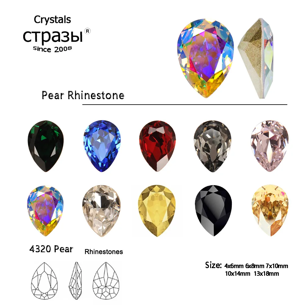 Цвет: прозрачный, ab, золотой, синий и т. Д.Форма: грушаМатериал: Хрустальное стеклоУпаковка: 6x8 мм-10 шт.Используется для: нейл-арта, одежды, обуви, сумок...Вид транспорта: UPS DHL FEDEX TNT AliexpressДемонстрация товара: